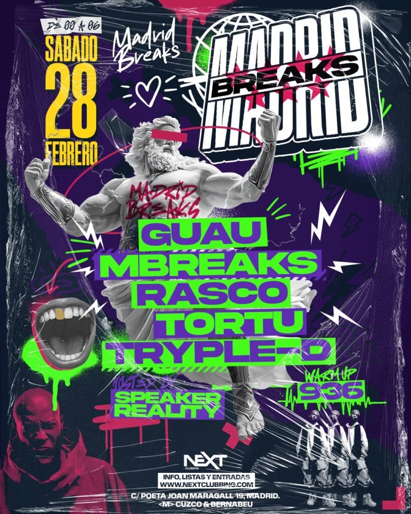 Next Club será testigo de una noche épica el próximo 28 de febrero con un cartel para la historia Tras el rotundo éxito de la primera edición en Next Club, el auténtico ritmo andaluz regresa a Madrid el 28 de febrero para volver a romper la pista. Una noche donde el breakbeat, la energía del sur y el espíritu underground se dan la mano. Grooves contundentes, basslines sin concesiones y una atmósfera pensada para bailar sin frenos. Madrid Breaks no es solo una fiesta, es una conexión directa con la cultura break, una celebración del sonido que nunca se fue y que ahora vuelve más fuerte que nunca. Uno de los puntos fuertes de este evento será su line up, en el que actuarán leyendas como Tortu, uno de los nombres más sólidos del breakbeat andaluz. Con base en Málaga, su sonido mezcla bajos demoledores, ritmos rotos afilados e influencias rave que encienden la pista desde el primer drop. Como DJ, destaca por sets dinámicos y precisos, llenos de edits y transiciones quirúrgicas que mantienen la tensión al límite. Como productor, ha firmado lanzamientos que reflejan su crudeza club y atención al detalle, con soporte en sellos y playlists de la escena. Rasco es una leyenda viva del breakbeat. Comenzó en 1992, con 13 años, recorriendo pubs y discotecas de Huelva. Desde entonces, figura imponente de la escena: técnica salvaje en vinilo y digital, precisión mordaz en la mezcla y una trayectoria de más de dos décadas manteniéndose en la cima, adaptándose como camaleón a cada deriva del género: breakbeat en estado puro. Tryple-D es un proyecto sevillano de breakbeat formado por Seveng, Bad Legs y Basstyler. El trío ha logrado consolidarse dentro de la escena andaluza gracias a un sonido potente y actual, con producciones como “Interestelar” y colaboraciones destacadas como “Evildoers” junto a MIAU, editada en Space Pizza Records. Su presencia ha crecido en eventos de gran formato, actuando en festivales como Dreambeach 2025 y participando en citas especializadas como Breakbeat Fest en Industrial Copera o Híbrida Fest. Carmen, también conocida como MBreaks, es una estrella en constante ascenso en la escena del Breakbeat y UKG en España. Su estilo sonoro combina ritmos cargados de bajos con elementos melódicos, haciendo que sus temas sean perfectos para oir en el gimnasio, en fiestas, mientras conduces o cualquier momento en el que quieras música energética y pegadiza. Desde Mallorca llega el jefe del sello 83, GUAU, uno de los productores españoles con más proyección internacional. Prepárate para una sesión cargada de temas frescos, potentes y novedades inéditas que no te dejará respirar durante todo su set. Speaker Reality una pieza fundamental acompañando a los mejores djs/productores del panorama Breaks internacional. Si hay alguien que ha hecho retumbar una sala sin poner ni un solo tema, ese es Reality. Aliciente para cualquier festival, te hará vivir esos momentos mágicos que aún perduran en la memoria de muchos de los mejores festivales de nuestro país y donde en los próximos meses presentará sus primeras producciones como vocal con productores de renombre en la escena nacional e internacional. Por último disfrutaremos del talento de 936, DJ, productor y promotor (Intenso Club) español conocido por su enfoque energético y basado en los ritmos rotos. Su sonido fusiona elementos de UK Garage, Breaks, Drum and Bass y electrónica contemporánea con una sensibilidad por los bajos potentes. Ha actuado en Londres, Estados Unidos, Japón y ciudades de España, destacando por sets intensos, dinámicos y llenos de carácter propio. Acumula energía, carga las baterías, ponte en forma, porque el sábado 28 de febrero en la sala NEXT no habrá excusas para darlo todo, para dejar hasta la última gota de sudor electrónico en la pista de baile. Y recuerda, Madrid Breaks no deja supervivientes. Consigue tu entrada aquí.