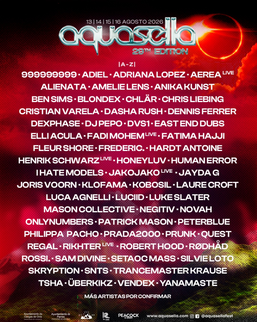 Aquasella continúa engordando su cartel. La nº 29 edición del festival en agosto 2026 añade esta vez nueve nombres, que se incorporan al cartel. El festival más esperado en la escena techno del verano, tendrá lugar los días 13, 14, 15 y 16 de agosto en Arriondas y ha añadido seis nuevas actuaciones los últimos días.