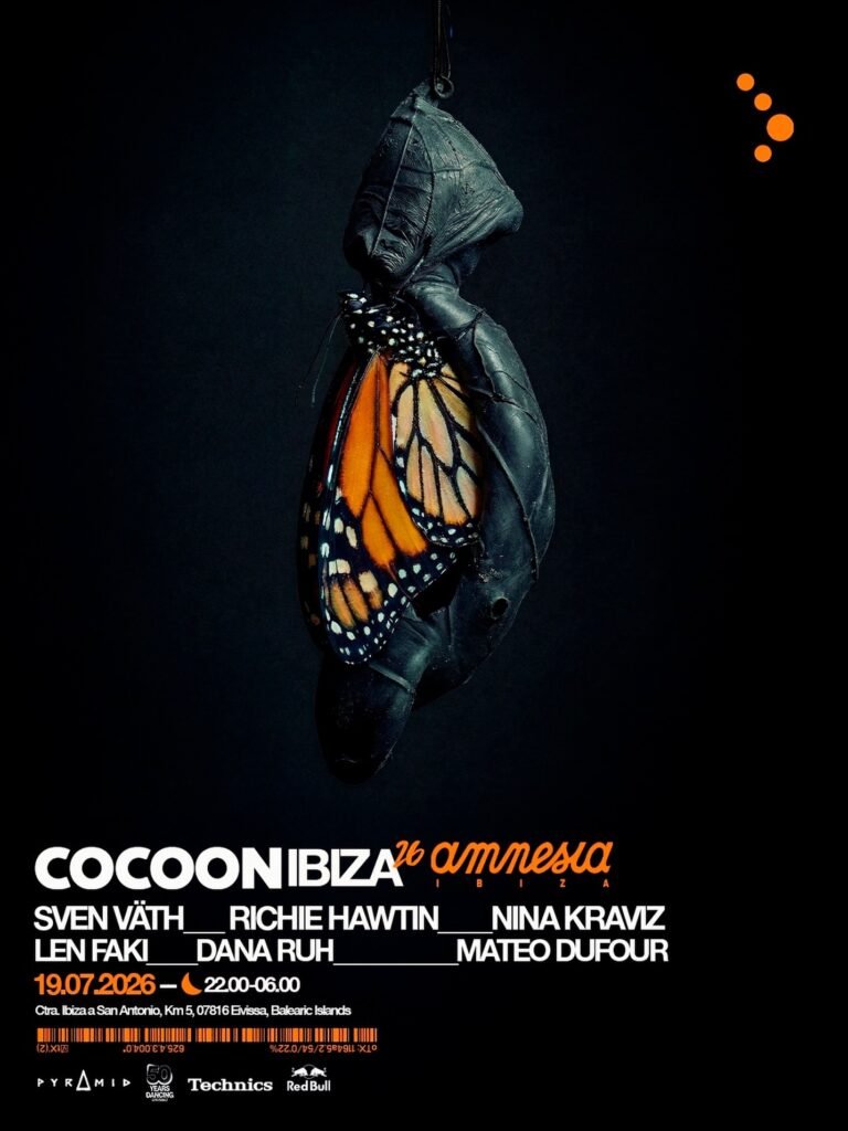 Este año, Papa Sven estará acompañado de Dana Ruh, Len Faki, Mateo Dufour, Nina Kraviz y Richie Hawtin En la historia de Ibiza ha habido malas fiestas, buenas fiestas, grandes fiestas y fiestas que han cambiado el paradigma de la escena electrónica no tan solo en la isla, también en el mundo entero. Una de esas fiestas sin duda alguna fue Cocoon Ibiza, un concepto creado por Sven Väth que se convirtió en una referencia incuestionable y que encontró en Amnesia el espacio perfecto para desarrollarse. El 19 de julio de 1999, Cocoon celebró su primera fiesta en Amnesia Ibiza, el 19 de julio de 2026, exactamente en la misma fecha, la mítica fiesta vuelve a tomar el control de su hogar 27 años después. En Cocoon, siempre se busca volver a lo básico y a la esencia de la música electrónica de baile, relegando la cultura VIP a un segundo plano, promoviendo sesiones más largas y permitiendo que los DJs invitados exploren un territorio más amplio y se ganen la confianza del público. Este mismo enfoque musical se refleja en las fiestas, dondequiera que se celebren. Para este evento tan especial se subirá a la cabina Dana Ruh, una de las activistas del house crudo y underground desde hace eones de tiempo, la vida le dá para llevar un sello impecable, una tienda de discos de vinilo y además hacer música y salir a tomar algo. También estará presente Mateo Dufour, nacido en Buenos Aires, Mateo es uno de los DJs y productores sudamericanos más prometedores y una pieza importante del team de Key Records. Dos artesanos del sonido se unen a la celebración, el primero Len Faki, que ha encontrado cada vez más placer en editar pistas para sus sets de DJ para crear su propio universo musical y desarrollar aún más su sonido único en el escenario. El estilo de ejecución de Len Faki, seco pero comunicativo, lo distingue como un verdadero caballero detrás de los platos, un artista cuyos sets se basan en la pasión y la belleza crudas, que utiliza las yemas de los dedos como sensores en una escala de Richter, midiendo, anticipando y provocando erupciones en la pista de baile. La segunda es la irreverente Nina Kraviz, asistir a uno de sus sets es una incógnita, nunca sabes por dónde va a salir y en qué camino sonoro va a adentrarse. Además su energía en el escenario, su forma de moverse, cómo se enfrenta al público sin ningún tipo miramientos, es altamente hipnótica. Richie Hawtin vuelve al club y a la fiesta que cambió su forma de entender la cultura clubbing, el club que le tatuó una sonrisa infinita en su boca. Por eso y por mucho más esta actuación de Richie Hawtin es una de esas que no te puedes perder. Por último el gurú de Cocoon, porque Sven Väth no solo es un modelo musical, es un modelo de comportamiento y de actitud, una imagen a la que imitar y una voz a la que escuchar, ya que de sus palabras solo se puede esperar sabiduría. Con su pasión por los vinilos que agita, hipnotiza al público y se lo lleva con él. En un set de Sven te encuentras en una actuación en la que nadie sabe lo que va a pasar. Siempre ha sido así. Consigue tu entrada aquí.