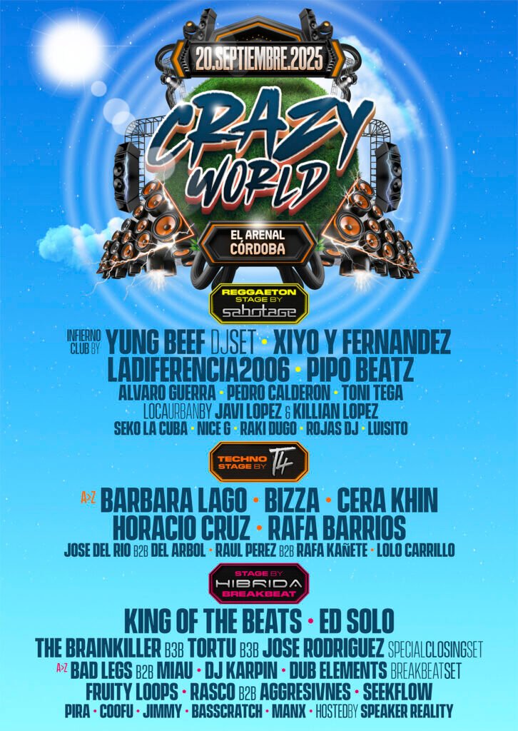 Cera Khin, Bárbara Lago, Horacio Cruz, BiZza y Rafa Barrios nos regalarán momentos electrónicos inolvidables. La locura máxima está a punto de llegar al festival Crazy World, el momento perfecto para ponernos bien prieta la camisa de fuerza y dejarnos llevar por la música más alocada del momento. De todos los artistas que se pasarán por el festival, queremos destacar 5 que estarán en el escenario T4 y que conseguirán que el próximo 20 de septiembre en El Arenal de Córdoba la tierra tiemble bajo nuestros pies: CERA KHIN DJ y productora de música conocida por su techno, acid, gabber, hardcore y sets atrevidos y eclécticos. Fundó el sello LazyTapes y lanzó los EPs Guided Meditation con Ossia y Demons to Some Angels To Others. Se mudó a Barcelona en el 2022 y creó la iniciativa en línea Technomentalhealth para apoyar el bienestar mental en la comunidad de música electrónica. En su última entrevista explica: «Mi misión como DJ es compartir la música que me gusta con la gente y hacer que se vuelvan locos y se olviden de todas sus preocupaciones. Para mí, pinchar música y animar a la gente van de la mano. Estoy aquí para entretener a la gente y pasarlo bien todos juntos. También me gusta mucho bailar, literalmente no puedo estar detrás de la cabina sin bailar y necesito sincronizar los movimientos de mi cuerpo con la música para mantener el ritmo. Supongo que también soy bastante empática, por lo que me resulta fácil leer al público y entender qué ambiente debo crear». BARBARA LAGO Desde los 16 años, Bárbara Lago comenzó a interesarse por la música electrónica asistiendo a eventos hasta que, a los 22 años, dio un paso más y decidió comprar su primer equipo para dar rienda suelta a sus inquietudes. Un año después comenzó a actuar en público en clubes locales. Es en 2016 cuando, tras pinchar varias veces en las fiestas electrónicas Wake Up, se consolida como DJ residente en El Pelícano. Esto le dio una visibilidad que la llevó a recorrer grandes clubes y festivales. Su nombre siempre ha estado ligado al techno pero su estilo ha evolucionado desde sus inicios. Un viaje temporal desde sonidos más melódicos en sus inicios, pasando por el acid techno hasta texturas frías e industriales pasando por estilos como el hard techno o el trance. Sus sets se caracterizan por su energía, donde pincha temas con sonidos duros mezclados con sonidos raves. HORACIO CRUZ Horacio Cruz comenzó su carrera en la industria musical a una edad muy temprana, tocando la batería en muchas bandas de rock hasta que descubrió la música electrónica. En 1997 comenzó a girar un par de platos Technics y se sintió enamorado del Techno. Su duro trabajo y desarrollo en el género le permitió ser considerado uno de los referentes de la escena Techno española y un valor en alza en el ámbito internacional tras años de compartir cabina con algunos de los mejores artistas de la escena. En 2003, Horacio Cruz publicó sus primeros vinilos, herramienta que utiliza en sus característicos sets de 3 platos llenos de velocidad y técnica. Horacio Cruz es una apuesta segura para cualquier evento ya que ha visitado con éxito países como Italia, Portugal, República Checa, Eslovenia, Alemania, Polonia, Austria, Francia y Croacia entre otros, y ha pinchado en los mejores clubes y festivales de España y Europa como Creamfields, Apokalypsa, Beats 4 Love, Electrobeach, Dreambeach, Circus Nation, Aquasella o Weekend Beach. Horacio Cruz es sinónimo de calidad, técnica impecable y seriedad en la mezcla por parte de este arquitecto del Techno de alta gama. BIZZA Sergio Bizarro Ávila (Madrid, 1993), conocido como BizZa, es un singular caso de éxito transitando a contracorriente en la escena electrónica. Recorriendo el camino inverso de la mayoría de artistas, él llevaba una década pinchando y comenzó a producir hace apenas año y medio, durante la pandemia. En un tiempo récord, su música se ha colado entre los grandes, rondando las posiciones de cabeza de Beatport y sonando en eventos de todo el mundo. A lo largo de los años, ha ido moldeando y perfeccionando su sonido y hoy en día consigue dar a sus sesiones un toque único con ritmos llenos de groove, voces exóticas y mucha energía. Hoy en día, BizZa ha compartido cabina con grandes artistas de la industria como Luciano, Joseph Capriati, Dennis Cruz, Andrea Oliva, Cuartero, Héctor Couto, Rafa Barrios, Melanie Ribbe, Neverdogs, Ale de Tuglie, WADE, Karotte, Viviana Casanova, Chelina Manuhutu, Bastian Bux, Rendher, Jhon Digweed, Artman, Deborah de Luca, entre muchos otros. RAFA BARRIOS Rafa Barrios es un productor sevillano, que junto a su sello Bandidos está de moda por todo el mundo. Ha actuado en eventos de todo el mundo entre los que destacan elrow, BPM Festival, Space Miami o Tulum por citar algunos. Sus tracks son tocados por los mas grandes Carl Cox, Richie Hawtin, Marco Carola, Chus & Ceballos, Kaiserdisco, Dubfire, Gel Abril, Stacey Pullen. Trabajando en muchas colaboraciones con Dj Chus, así como también Steve Mulder y otros, ha sido remixado por Carlo Lio, Doomwork, Grazzini, Patrick LIndsey,Tapesh, Maximiljan, remixando a grandes artistas como Danny Tenaglia, Kim English, Chus & Ceballos, Boris, Gabriel Ananda… Pero Crazy World no solo es un festival con el mejor techno del momento, el breakbeat más estimulante del presente y del pasado se abrirá paso en este escenario gracias a la gente de Hibrida Fest. En esta ocasión el line up estará formado por King of the Beats, Ed Solo, The Brainkiller b2b Tortu b2b Jose Rodriguez, DJ Karpin, Miau b2b Badlegs, Dub Elements (breakbeat set), Rasco b2b Aggresivness, Fruity Loops, Seekflow, Speaker Reality, Pira, Coofu, Jimmy, BasScratch y Manx. Los amantes del sonido urbano están de enhorabuena, ya que en Crazy World tendrán un espacio perfectamente diseñado para ellos. Los artistas que participarán serán Yung Beef DJ Set, Xiyo y Fernandez, La Diferencia 2006,