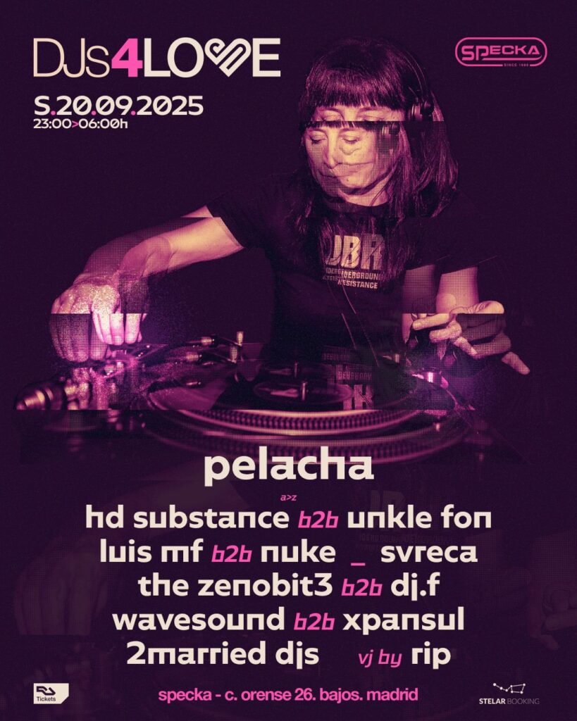 Nos alegra dar esta gran noticia que es la vuelta a la acción de nuestra amiga Pelacha tras un año de lucha , la vuelta será en uno de los Clubs más míticos de Madrid, Specka Club en lo que sin duda será una gran noche de Techno acompañada por buena parte de los Djs más representativos de la capital durante las últimas decadas. «Holaaa a todos/as De nuevo aquí, para contaros algo sublime::: el enorme detalle por parte de mis compañeros de profesión que han organizado una fiesta para mi, y apoyarme no solo moralmente que ya es mucho de agradecer, sino también económicamente después de casi un año sin poder trabajarEspecialmente a @rosyspecka que intuyo ha liderado todo este proyecto y no es fácil, te quiero amiga! Y la predisposición de la sala @speckaclub mil gracias!Fecha del evento: S20/Sept/2025 Como sabéis he pasado un complejo proceso de Salud del que estoy saliendo poco a poco 👏👏👏👏Todo esto ha sido un atropello de la vida que para nada me esperaba, pues somos, a veces, algunos/as, tan engreídos, que damos por sentado “esto no me va a pasar a mi” cuando de repente te ves envuelto en una situación de impotencia que no te queda más remedio que “hincar las rodillas” en un acto de humildad y asumir “que lo que es, es” y abrirse a la vida con todo y aprender a recibir, que ha sido una de las lecciones más importantes para mi crecimiento y evolución Entonces te ánimo a participar de este gran momento para mi» PELACHACompra tu entrada aquí:https://ra.co/events/2228092 @hdsubstance@unklefon@luismf_luismifamily@nuke_dj@svreca@the_zenobit3@djf_ideograma ama@wavesound.moredrama@xpansul@visionrip@rosyspecka@santispecka@rafuchosparrow@speckaclub @stelarbooking #madridnight#clubbing#dj#techno#electro#dancing
