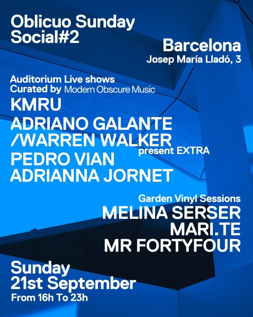 El domingo 21 de septiembre en el Espacio IMO de San Gervasi (Barcelona) estás invitado a una experiencia electrónica única. Aquellos gourmets electrónicos que viven en Barcelona conocen perfectamente una de las propuestas más estimulantes de la ciudad condal llamada Oblicuo Hi-Fi Bar. Un espacio que apuesta por la calidad del sonido, inspirado en los Jazz Kissa japoneses, espacios que nacieron en la década de 1930 en los que se mezclaba el whisky, los vinilos y los sistemas de audio de alta gama. Pues bien, los creadores de este concepto vuelven a repetir una fórmula inspiradora, OBLICUO SUNDAY SOCIAL, que ya nos maravilló en su primera edición en la FX Barcelona Film School. En esta ocasión el evento crece y tendrá lugar el 21 de septiembre en el Espacio IMO situado en el barrio de San Gervasi (Barcelona). Gastronomía de calidad (comida mexicana by METL, sandwich by PICNIC y oferta vegana) y sobre todo música de calidad dividida en dos espacios. En colaboración con el sello independiente Modern Obscure Music, que explora los límites entre diferentes disciplinas basándose en la escucha profunda y la investigación musical, se explorarán los sonidos ambientales en todas sus variantes en cuatro conciertos: KMRU, ADRIANO GALANTE con WARREN WALKER, PEDRO VIAN y ADRIANNA JORNET. Joseph Kamaru, también conocido como KMRU, es un artista sonoro y músico ambiental experimental, criado en Nairobi, Kenia, y actualmente afincado en Berlín, donde cursa un máster en Estudios Sonoros y Artes Sonoras en la Universität der Künste. Sus obras tratan sobre discursos de grabación de campo, improvisación, ruido, ambiente, aprendizaje automático, arte radiofónico y drones hipnóticos expansivos. ADRIANO GALANTE y WARREN WALKER nos ofrecerán una colaboración con música que te hará estremecer, directa a los resortes que activa esa pastel cerebro que nos hace trascender. PEDRO VIAN es el fundador del sello discográfico Modern Obscure Music, un artista en mayúsculas que no deja de sorprender por su conocimiento técnico y su facilidad para encontrar nuevas formas de expresión musical. ADRIANNA JORNET es una artista que no deja de sorprender, multifacética y tremendamente creativa cada vez que se sube a un escenario. El otro espacio de OBLICUO SUNDAY SOCIAL tendrá lugar en el HI-FI Garden y acogerá sesiones eclécticas de DJs a cargo de MELINA SERSER, MARI.TE y MR FORTYFOUR. En una escena saturada de propuestas repetitivas, OBLICUO SUNDAY SOCIAL nos invita a profundizar en las raíces de los sonidos experimentales, un camino excitante y productivo que te hará crecer como amante de la música. Consigue tus entradas aquí