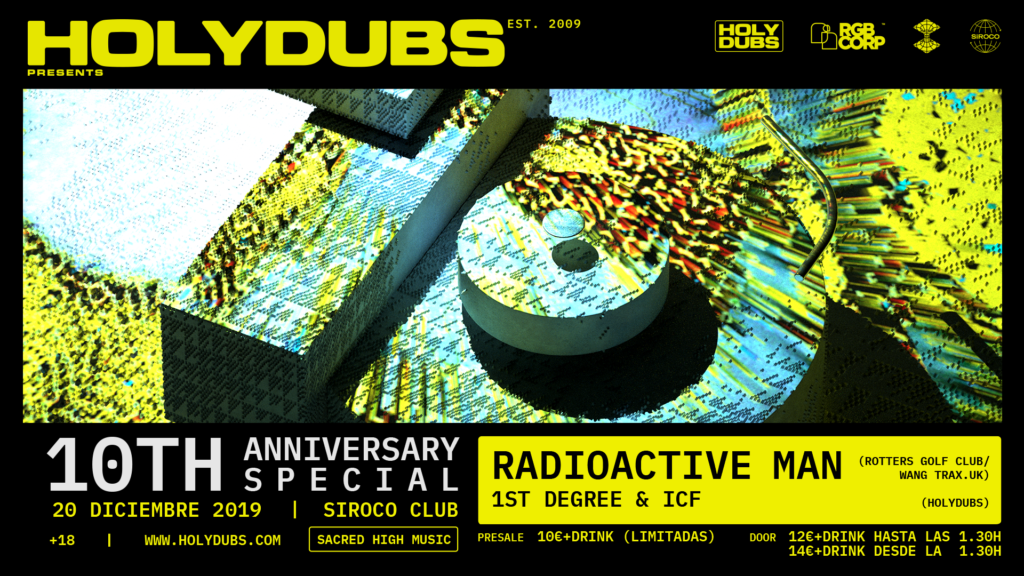 La promotora anuncia a Radioactive Man como el gran invitado de su fiesta 10º Aniversario en la sala Siroco el día 20. Además se presentará merchandising oficial de la marca en un encuentro especial en Monkey Garage con actuaciones en directo. Las celebraciones arrancan con 1st Degree e ICF, creadores de Holydubs, como invitados en la sala Trax (Vigo) el 5 de diciembre. Cumplir diez años como fiesta y promotora prominentemente underground en un circuito como la escena electrónica madrileña -siempre en permanente cambio- no es nada sencillo. En ese tiempo Holydubs se ha posicionado por derecho propio en uno de los máximos exponentes a nivel nacional en lo que a música de vanguardia se refiere apostando por artistas del calibre internacional de Objekt, Kode9, Mike Paradinas, DMX Krew, Conforce, Skee Mask o Alessandro Cortini, entre otros en sus fiestas. ¡Y es hora de celebrarlo! Para ello la propuesta comandada por 1st Degree e ICF presentan una serie de eventos a lo largo del mes de diciembre. El primero de ellos es la visita de los responsables de Holydubs a Salitre en la viguesa sala Trax el próximo 5 de diciembre. Ambos djs abogan por un estilo en el que borran la línea entre techno, breaks, idm y el hardcore continuum inglés para tratar de ir un paso más allá. Cualidad que les ha llevado en esta década a pinchar en ciudades como Bogotá, Londres, Tulum, Ibiza, Barcelona y ahora en Vigo. Las entradas pueden adquirirse desde aquí. La segunda cita será un encuentro especial en Madrid el próximo 15 de diciembre (18.00h) en el céntrico Monkey Garage en horario vespertino. La ocasión lo requiere porque se tratará de la presentación oficial del nuevo merchadising de Holydubs (camisetas, totebags, stickers) en un espacio íntimo y vanguardista por el que pasarán ilustres artistas de la escena madrileña para amenizar la velada con actuaciones en directo. La fiesta por el 10º aniversario como tal se llevará a cabo el viernes 20 de diciembre en la popular Sala Siroco, epicentro de las fiestas Holydubs en estos últimos años en la capital. Para una fecha tan señalada contarán como invitado de excepción a Radioactive Man. El dj y productor inglés es una de figura emblemática del electro europeo y su presencia en Madrid coincide con el lanzamiento de Doors To Manual, una retrospectiva de sus 20 años de carrera editado en un box set especial de 4 vinilos. 1st Degree e ICF ejercerán de anfitriones y dj residentes en una noche ideada para no parar de bailar y brindar por otros diez años más. Las entradas ya están a la venta pinchando en este enlace. www.holydubs.com