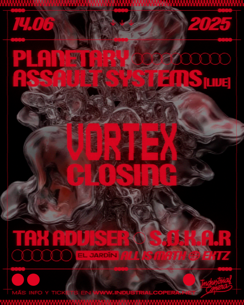 Este sábado 14 de junio Industrial Copera cierra su programación electrónica con VORTEX y Planetary Assault Systems (Live), Tax Adviser, S.Ø.K.A.R, All Is Math y EKTZ