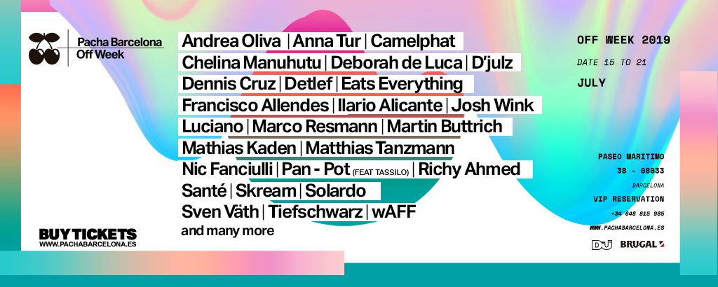 Off Week 2019 tendrá lugar en Pacha Barcelona del 15 al 21 de julio En un 2019 lleno de grandes cambios para Off Week tal y como la conocemos hasta ahora, Pacha Barcelona vuelve a la carga desvelando su programación completa para la próxima semana grande de la electrónica en la Ciudad Condal. Una agenda que se desarrollará entre el 15 y el 21 de julio de este 2019 y que, una vez más, traerá a los nombres más grandes de la música de baile a Pacha Barcelona para un maratón electrónico como pocos en la ciudad… Todo empieza el mismo 15 de julio, con la vuelta de una de las sesiones más queridas del público de Pacha: Umamii. La experiencia multisensorial vuelve a Barcelona para traer a cuatro titanes de la escena actual: Deborah de Luca y Giorgia Angiuli (Live) pondrán acento italiano a una sesión que completan el británico Richy Ahmed y Piem. Consigue entradasaquí. Al día siguiente, el 16 de julio, Pacha Barcelona une sus fuerzas con uno de los clubes más icónicos de la escena underground alemana, Watergate, para una noche de techno sin contemplaciones. El club berlinés y la sesión underground de Pacha Barcelona, SIGHT, se han hermanado para esta Off Week y su noche la encabezarán grandes amigos de ambos clubes, como Ilario Alicante, Eats Everything, Tiefschwarz, Jimi Jules o Matthias Meyer, entre otros. Consigue entradas aquí. Seguidamente, el 17 de julio, la pista de Pacha se verá invadida por la energía sin igual de la colonia más famosa de la música electrónica. ANTS vuelve a Pacha Barcelona, de la mano de una de sus cabezas visibles, Andrea Oliva, secundado por el b2b entre los dúos Camelphat y Solardo, Chelina Manuhutu, Francisco Allendes, Secondcity y el gran Skream cierran uno de los días más esperados de la semana. Consigue entradas aquí. El 18 de julio, jueves, llega otro de los platos fuertes de la Semana Grande de la electrónica en Barcelona. Cocoon, con Papa Sven en cabeza, vuelve a su casa en la ciudad para premiar a uno de los públicos más fieles y que más le quiere con una dosis de electrónica vinyl-only. Además de Sven, la Main Room de Pacha verá la sesión de André Galluzzi y, por su parte, la Black Room bailará al ritmo de Dorian Paic, Fabe y Emanuel Satie. Consigue entradas aquí. Posteriormente, el 19 de julio, es el turno de otra sesión fija de Off Week en la Casa de las Cerezas. El queridísimo Matthias Tanzmann y su Moon Harbour vuelven a Pacha Barcelona con su tradicional showcase de Off Week y lo hará acompañado por una cornucopia de artistas de gran talla, como wAFF, Martin Buttrich, Santé, Dennis Cruz, Manu Gonzalez, Matthias Kaden y promesas de la escena y del sello como Miane. Consigue entradas aquí. Entrando en pleno fin de semana, el 20 de julio, será el turno de otro gran favorito del público, que repite tras el tremendo éxito del año pasado. Luciano & Friends vuelve a Pacha Barcelona con lo que es un line-up de escándalo, compuesto por el icónico Josh Wink, D’Julz, Anna Tur y Andre Butano.Consigue entradas aquí. Y para cerrar la Semana Grande de la electrónica en la Ciudad Condal, el domingo 21de julio verá a Nic Fanciulli tomar la cabina de Pacha Barcelona con su concepto Nic Fanciulli & Friends, para repartir musicón como sólo él sabe y acompañado por Pan-Pot (feat Tassilo) y William Djoko. En la Black Room tendrá lugar un showcase de la revista DJ Mag España, que traerá a algunos de los artistas más interesantes de la escena. Consigue entradas aquí. Con semejante elenco de pesos pesados, unidos a las promesas de la electrónica más deslumbrantes, esta Off Week 2019 promete ser uno de los ciclos más fuertes del año para Pacha Barcelona.