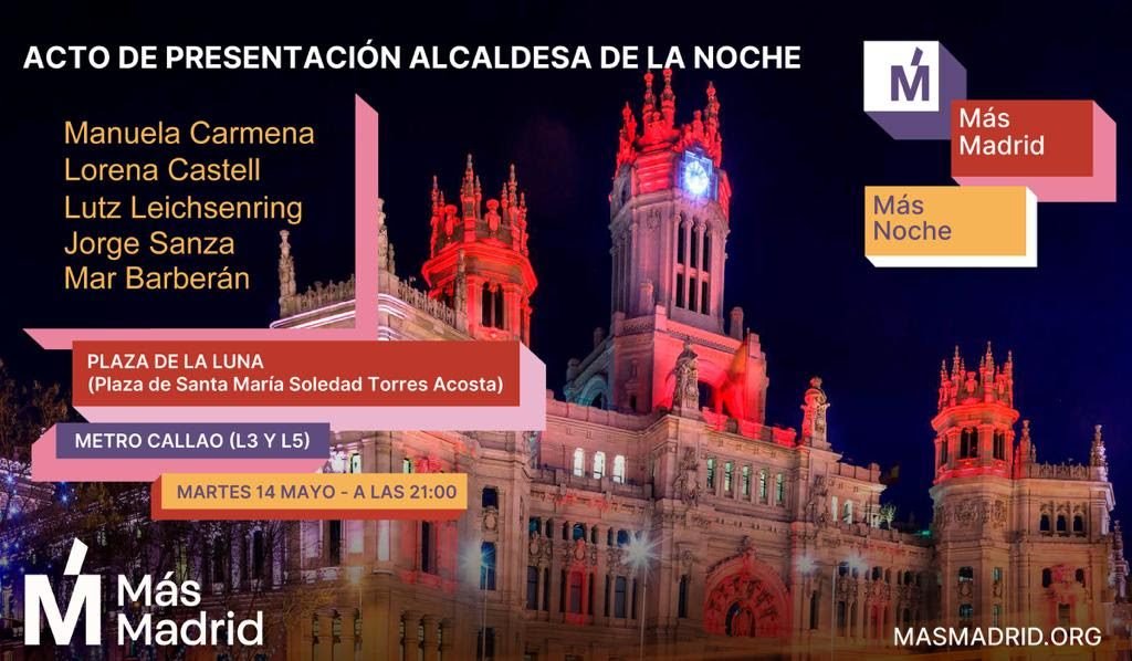 Más Madrid se suma a un movimiento global que tomará como punto de partida el barrio de Malasaña. El próximo 14 de mayo el partido liderado por Manuela Carmena cita a todos los agentes del Ocio Nocturno en la Plaza de la Luna (21:00). El motivo, la creación de un estamento que seguirá la estela de ciudades como Ámsterdam, Berlín, Londres o Nueva York. La gran transformación que vive la ciudad de Madrid en los últimos cuatro años se extiende a la noche de la ciudad. Más Madrid, el nuevo partido liderado por la actual alcaldesa de la ciudad, Manuela Carmena, cita a todos los actores clave de la noche de la capital para anunciar un proyecto inspirado en el Night Mayor de Ámsterdam y la Club Commission de Berlín. El anuncio se realizará en un evento el martes 14 de mayo en La Plaza de La Luna (Plaza Sta. María Soledad Torres Acosta) a las 21:00, frente a medios, participantes del ocio nocturno y ciudadanos de Madrid (quienes la disfrutan, quienes la administran, quienes trabajan y quienes residen en ella). La ciudad se une así a un movimiento internacional instaurado en más de cuarenta ciudades de todo el mundo, un estamento que dependerá del Ayuntamiento y que trabajará como punto de encuentro entre los propietarios de los locales, promotores, los vecinos y la alcaldesa con el objetivo de potenciar y proteger las industrias culturales. Dentro del programa de actos previos a las elecciones autonómicas y locales, Más Madrid muestra su interés por ampliar los beneficios de la economía nocturna con los objetivos de generar empleo, reducir la contaminación acústica, potenciar las industrias creativas, en definitiva, crear una ciudad más saludable, vibrante y habitable para una población diversa y de todas las edades. Además este tipo de iniciativas pueden promover la regeneración y la disponibilidad de algunos servicios municipales para adaptarse a las necesidades de la ciudadanía. Malasaña será donde se presentará la Alcaldía de la Noche de Madrid y el barrio donde se comenzará a implantar medidas. Un barrio donde ya hace meses se comenzó a trabajar a través de la figura de la Comisionada de Malasaña, y donde ahora se da continuidad a la intervención realizada a través de esta figura. Además, su situación estratégica, conocida como un punto de alta concentración de intereses culturales y económicos, la convierten en el mejor punto de partida de este prometedor proyecto. EN EL ACTO INTERVENDRÁN El acto contará con la intervención de representantes de Berlín (Lutz Leichsenring) y Ámsterdam (Mirik Milan), la alcaldesa Manuela Carmena, la Comisionada de Malasaña (Mar Barberán), diversas organizaciones interesadas y la presentación por parte de Lorena Castell. Se cerrará con una actuación musical para todos los asistentes. DATOS ECONÓMICOS DE INTERÉS Por citar algunos ejemplos internacionales, la economía nocturna aporta 10.000 millones de dólares en Nueva York y genera 1,3 millones de empleos en Reino Unido. Un estudio reciente confirma que el “turismo de club” aporta 1.500 millones de euros en Berlín, capital mundial del ocio nocturno, tras el trabajo de estamentos como la ya mencionada Club Commission. En España, a falta de implantar medidas progresistas que puedan adaptarse al sentido común internacional, el ocio nocturno representa el 1,8% del PIB nacional y emplea a más de 300.000 personas.
