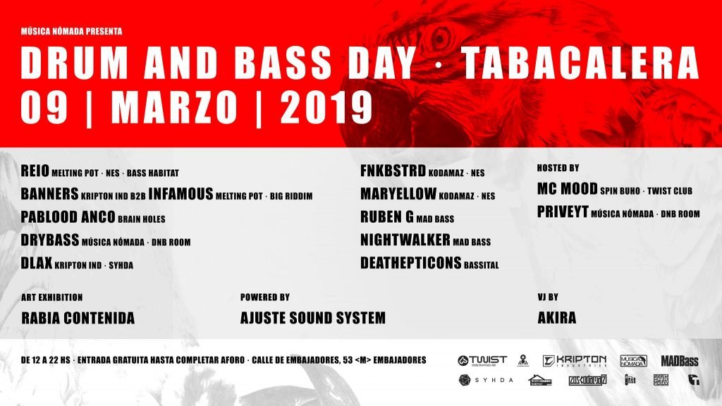 Al loro! Música Nómada se complace en presentar Drum And Bass Day · Tabacalera 2019. Mucho más que una fiesta, una reunión preciosa y emblemática de los engranajes que mantienen activa la maquinaria DnB Music en diferentes partes del territorio nacional; Como puede ser Twist Club, Kodama’Z o Mad Bass para Madrid. Kripton Industries en tierras manchegas. O artistas que son DnB activistas allá donde vayan como Pablood Anco de Brain Holes y Infamous dnb de Melting Pot Records entre otros; Quienes vayan donde vayan agitan los cuerpos de todo junglist smashing the dance floor. DJ Booth: Evento Facebook