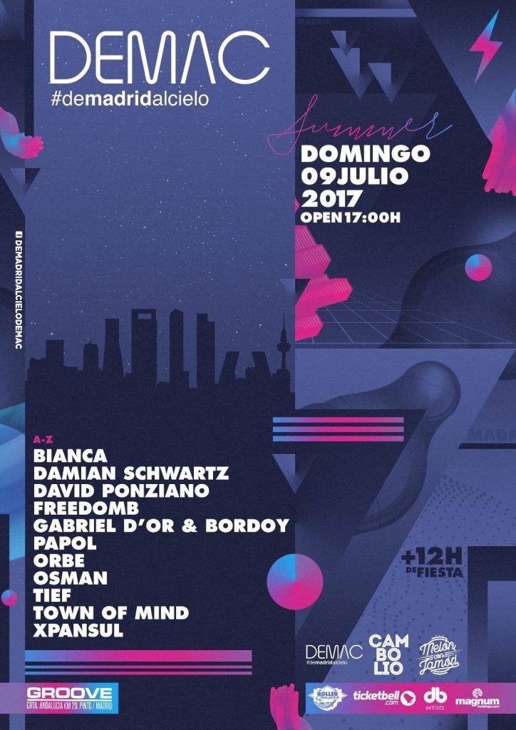 ◈ El Año Nuevo de 2017 nos trajo De Madrid Al Cielo, una fiesta electrónica cuyo line-up lo componían en exclusiva figuras destacadas de la escena madrileña. Una arriesgada apuesta que no dudaba a la hora de poner en valor el talento patrio concediéndole el espacio que merece. ◈ El próximo domingo 9 de julio llegará la edición veraniega de DEMAC repitiendo concepto con la presencia de Bianca, Damian Schwartz, David Ponziano, FreedomB, Gabriel D´Or & Bordoy, Papol, Orbe, Osman, Tief, Town of Mind y Xpansul. DEMAC, la idea que la sustenta y el proyecto que encarna siguen más vivos que nunca y así prometen demostrarlo el domingo 9 de julio en la sala Groove en la que será su edición especial de verano. Desde las 17:00 y durante las cerca de 12 horas que durará el evento De Madrid Al Cielo nos brindará las actuaciones de artistas consagrados y talentos emergentes de la escena electrónica madrileña. Si hablamos de exigencia, perseverancia, elegancia y perfeccionismo no podemos referirnos a otra que no sea Bianca, figura clave del circuito de la capital y una de las artistas con mayor proyección internacional del momento. Las tendencias más vanguardistas tendrán su representación de la mano de Damian Schwartz, habitual de CMYK Music y poseedor de uno de los directos más rompedores del panorama nacional. También estarán David Ponziano, ideólogo y creador de la sesión mensual Halley y FreedomB cuya ecléctica combinación de Jazz, Soul, Funk y Electrónica ha encontrado sitio en etiquetas de la talla de Knee Deep In Sound, Toolroom o Great Stuff. Quienes tampoco faltarán a la cita son el exitoso dúo propietario de Selected Records Gabiel D´Or & Bordoy, el consagrado Papol, integrante histórico del colectivo RDT y fundador de proyectos como Esperanza Records, 11:00Am o el hipnótico y oscuro Blackplace, Orbe y su sonido absolutamente conceptual donde el futurismo y la experimentación son los protagonistas y Osman, rostro más que esencial del icónico Studio 76. Cierran el cartel Tief, quien aúna en sus sesiones el pasado y el futuro de la electrónica desde una perspectiva underground, el dúo conformado por ATK y OmarOmenos Town Of Mind y el pionero del sonido underground en la capital Xpansul, residente clave de Soma Experimental Club. DEMAC y su edición especial veraniega nos demuestran de nuevo que la capital no está precisamente exenta de calidad y talento electrónico. Las entradas ya pueden ser adquiridas a través de Ticketbell al precio de 15 €, incluyendo 2 consumiciones si entras antes de las 19:00h o 1 consumición en adelante.