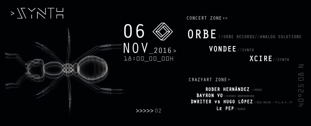 Concert Zone: ORBE (LIVE) + Vondee + Xcire CrazyArt Zone: Rober Hernandez DJ + Bayron V.O. + DWriter vs Hugo Lopez + Lê Pepe Colabora: Retrogressive Magazine, Madrid Is Techno, Clubbers Diary y XSMusic Precios por lista – invitación: 18:00 – 19:30 GRATIS 19:30 – 21:30 Entrada + 1 copa – 8€ Entrada + 2 copas – 12€ Sin lista: 21:30 – 00:00 Entrada + 1 copa 10€ Entrada + 2 copas 15€ Puedes apuntarte online en nuestra lista de invitados para obtener descuentos tanto en puerta como en las consumiciones. Rellena el formulario pinchando en este link: https://goo.gl/Aw90G6 -> Es imprenscindible presentarse en puerta antes de las 20:30 para entrar por lista de invitados. @SYNTH -Techno Lives Sets & Art Club Sala Republik Club Calle la puebla, 6. 28004 (Malasaña – Madrid) Todos los domingos de 18:00 a 00:00