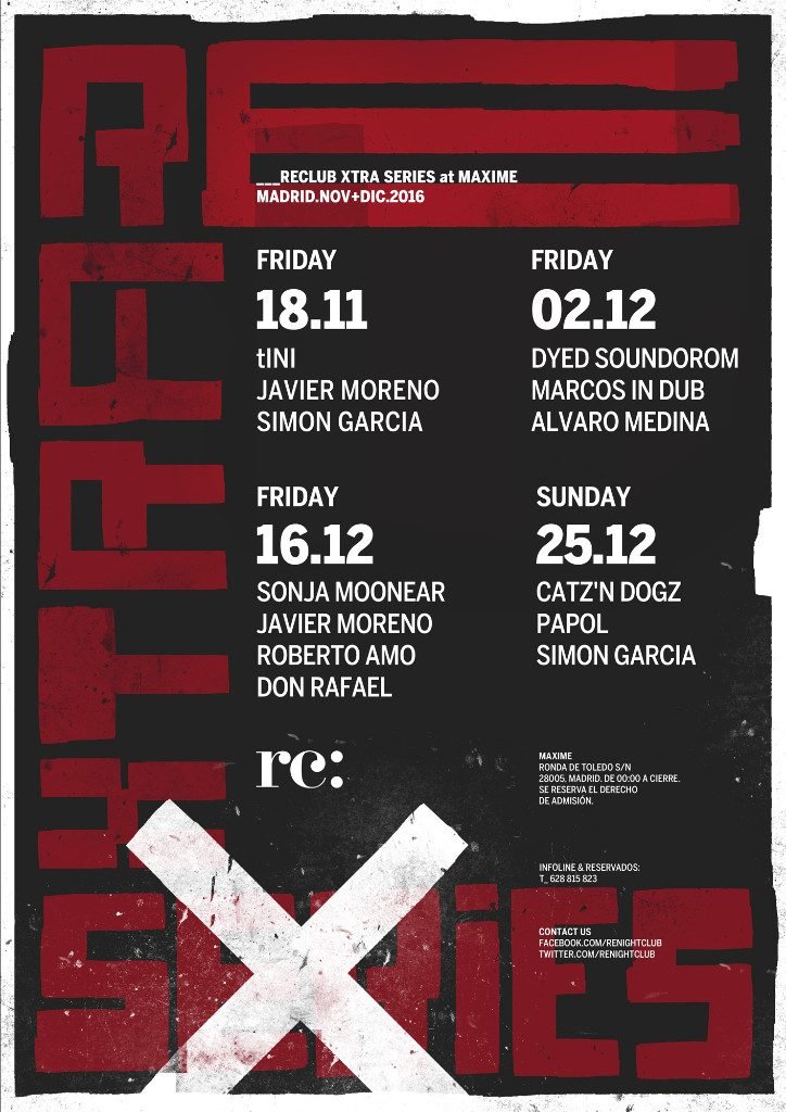 ReClub crece y anuncia 4 fechas especiales en Maxime con tINI, Dyed Soundorom, Sonja Moonear y Catz ‘n Dogz como principales reclamos. ● Tres viernes, 18 de noviembre, 2 y 16 de diciembre, y un domingo, el 25 de diciembre Navidad, serán los días marcados en rojo en el calendario para vivir estas cuatro noches inolvidables. Tal y como avanzábamos la semana pasada, ReClub se embarca en una nueva aventura: ReClub Xtra Series. Tras el buen sabor de boca obtenido con la celebración de su 2º Aniversario, el club madrileño ha estado trabajando en la idea de trasladar su filosofía, de manera eventual, a un espacio con mayor capacidad de aforo. La sala escogida para ello ha sido Maxime, uno de los espacios mejor preparados de la capital, con capacidad para 700 personas, un sistema de sonido rompedor y ubicado en pleno corazón de la capital. Hoy, ReClub da a conocer el elenco de DJs que formarán parte de estas 4 citas especiales. Para la primera de ellas, el viernes 18 de noviembre, tINI tomará los mandos de la cabina en Maxime. La artista germana, seña de identidad de Desolat, no estará sola y tendrá como escuderos al propietario de Colt, Javier Moreno y al incombustible Simón García. El viernes 2 de diciembre le toca el turno al francés Dyed Soundorom, parte activa del trío Apollonia y uno de los productores más reconocidos del país vecino. Le acompañarán Marcos In Dub y Álvaro Medina, dos imprescindibles de la capital. El 16 de diciembre, nuevamente viernes, es momento de disfrutar del showcase de COLT con el estilo único e inimitable de la suiza Sonja Moonear como invitada, perfecta representante del sonido Perlon, que actuará junto a Javier Moreno, Roberto Amo y Don Rafael, miembros de Colt. La última cita ReClub Xtra Series servirá para disfrutar de una particular noche de navidad, el domingo 25 de diciembre y con un dúo muy querido en la capital; desde Polonia Catz ‘N Dogz. El madrileño Papol, equilibrista sónico, y nuevamente el residente Simón García completan el Line Up de la noche. Cuatro encuentros que promenten ser inolvidables y que alzan aún más a ReClub como una de las marcas indispensables para entender y sustentar el clubbing de Madrid. Cuatro eventos que se unen así a la programación habitual de domingos de ReClub en la sala Goya 43. Faceboo