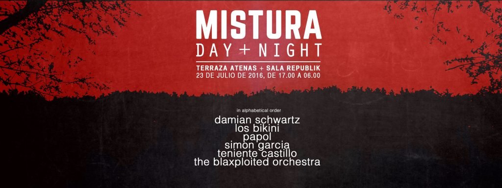 Mistura Day & Night · Summer Special _______________________________ Con motivo de nuestro cierre de temporada, este sábado Mistura propone un plan doble en el centro de la ciudad que incluye dos emplazamientos diferentes, terraza al aire libre por el día, club indoor por la noche y una selección de talentos madrileños durante más de 12 horas de acción y baile. Los lugares donde transcurrirá nuestra jornada especial serán la Terraza Atenas (un espacio integrado en el céntrico Parque Atenas) durante el día y Republik Club (nuestra sala habitual, a escasos metros de la Gran Vía) por la noche. Horarios y actuaciones: · De 17.00 a 23.00 en la Terraza Atenas, con Teniente Castillo, LosBikini y The Blaxploited Orchestra. Entrada gratuita. · De 00.00 a 06.00 en la Sala Republik Club, con Damian Schwartz, Simon Garcia y Papol. Precios según horario o gratis hasta las 02.30 con la pulsera que entregarán nuestros relaciones públicas durante el día en la terraza. ________________________________ Damian Schwartz [AHD] Simon Garcia [Poker Flat] Papol [Esperanza] LosBikini [Tici Taci] Teniente Castillo [Play Pal] The Blaxploited Orchestra [Slow Town] ________________________________ Sábado 23 de julio de 2016 Mistura Day & Night · Summer Special 17.00 – 23.00: Terraza Atenas. Parque Atenas, c/ Segovia. 00.00 – 06.00: Republik Club. c/ Puebla, 6.