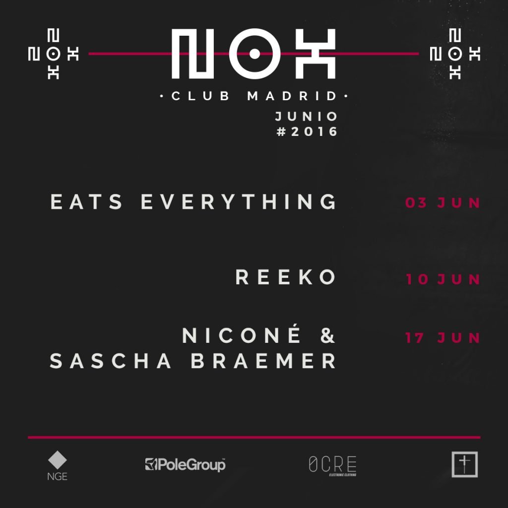 La cita semanal madrileña nos presenta su line-up para el mes de junio que incluye las actuaciones de Eats Everything, Reeko, Niconé & Sasha Braemer, quienes estarán además acompañados por los residentes SOSANDLOW, Miguel Gismero y Luke García. NOX se prepara para recibir el verano. Mientrás tanto, el mes de mayo se cierra este viernes con el gran Karotte a los mandos de la cabina en la sala Maxime. A continuación un resumen de lo que acontecerá en junio: El inglés Daniel Pearce, aka Eats Everything, abrirá el mes que recibe al verano en NOX el día 3 de junio. La suya puede ser considerada como una de las carreras más meteóricas de los últimos años. Su debut con el tema “Entrance Song” provocó un impacto en la escena como pocos se habían visto con anterioridad, ganándose de inmediato el apoyo de Seth Troxler, Carl Cox, Jamie Jones o Claude Von Stroke. Detrás de su éxito se esconde, además de su talento, su habilidad natural para conectar con el público y lograr la atmosfera perfecta. Una tarea en la que no se encontrará solo, ya que ese viernes contará con el dúo residente SOSANDLOW, los madrileños que se han ganado un sitio propio en los viernes de la capital. El viernes 10 NOX rezumará talento nacional con el asturiano REEKO. Un artista de habilidades innatas y prolífico donde los haya que además, cuenta con uno de los caracteres más perfeccionistas de la industria. Sin embargo, es probablemente su tendencia ecléctica lo que más destaca en su trabajo para lo cual ha utilizado innumerables alias y sellos como Mental Disorder o Evidence. Forma parte además de PoleGroup junto a Oscar Mulero, Exium y Christian Wünsch. Miguel Gismero y sus líneas musicales oscuras plagadas de elegancia y dinamismo oscilante entre el sonido más underground y las últimas tendencias serán los encargados del warm-up. El mes se cerrará el día 17 con la sesión CRÉAME y el dúo alemán Niconé & Sascha Braemer creadores del hit “Caje” convertido en un auténtico himno causante de miles de bailes a lo largo y ancho del globo terráqueo. El residente en esta ocasión será Luke García, un habitual de las escenas de Ibiza y Miami, además de su Madrid natal, y primer y único español del equipo Radio FG USA una de las más importantes del género a nivel mundial. Aunque el día 24 NOX no abrirá sus puertas porque su equipo se traslada al festival A Summer Story con quien colaboran, con estas tres fechas promete que la espera de su regreso no se hará demasiado dura. www.facebook.com/noxclubmadrid