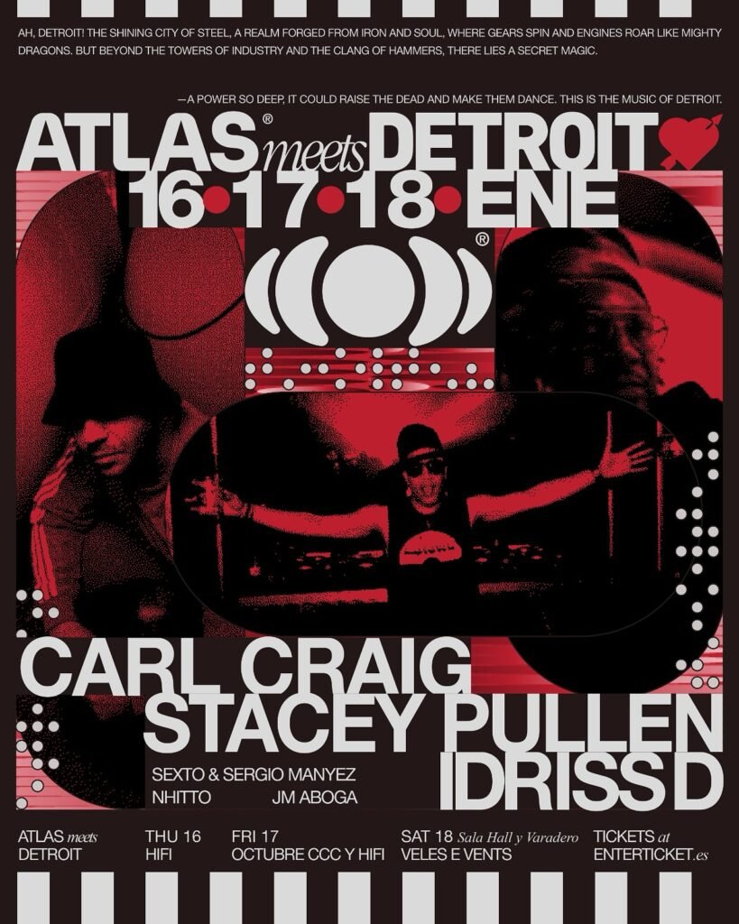 ATLAS es un proyecto concebido por el equipo de Metro Dance Club para celebrar la música electrónica como lenguaje universal La música electrónica es un lenguaje universal y una fuerza capaz de unir culturas. Bajo este concepto nace ATLAS, un ciclo que rinde homenaje a la influencia de la música electrónica en el mundo y a su impacto en diversos niveles culturales, sociales y artísticos. Del 16 al 18 de enero, ATLAS nos invita a explorar la influencia y el legado de la música electrónica de Detroit a través de un evento en la ciudad de València. Durante tres días, artistas, expertos y amantes del género se reunirán para celebrar la esencia de la ciudad que dio origen al techno. PROGRAMACIÓN El jueves 16 de enero arranca la aventura de ATLAS en HIFI, con una presentación oficial que marcará el inicio de este viaje. El viernes 17 de enero sigue la programación en el Octubre el Centro de Cultura Contemporánea albergará un monográfico sobre Detroit con David Verdeguer, acompañado de la proyección de un documental esencial. Más tarde, HIFI será el escenario de un set especial centrado en Detroit y de la «Sesión de Escucha» con Juan Atkins, el creador del techno tal como lo conocemos. El sábado 18 de enero será el día más importante de ATLAS, comenzando en Veles e Vents, explorando los orígenes y el impacto cultural de Detroit con una masterclass de Redhome sobre las primeras máquinas que dieron forma al sonido de la ciudad. También tendremos un coloquio histórico con Carl Craig, Stacey Pullen e IDRISS, tres nombres imprescindibles en la historia de la música electrónica. El punto álgido de esta jornada irrepetible se celebrará en la Zona Atlas LIVE, donde la música será la protagonista absoluta con las actuaciones de Sexto & Sergio Manyez, Nhittoy JM Aboga. Como guinda del pastel nos deleitaremos con el concepto Detroit Love, encabezado por Carl Craig, Stacey Pullen e IDRISS. UN PROYECTO DE LA MANO DE METRO DANCE CLUB Y AUDITION Esta iniciativa está llevada a cabo por Metro Dance Club, el icónico templo de la música electrónica en Alicante y Audition, un proyecto musical centrado en la escucha guiada de la música, que genera encuentros entre artistas y especialistas del sector con su público. El ciclo tendrá continuidad durante los próximos meses del año, y todas las fechas se celebrarán en un formato exclusivo, con aforo limitado para garantizar una experiencia única e inmersiva. INFORMACIÓN Y ENTRADAS Las entradas ya están disponibles a través del siguiente enlace a su ticketera: https://www.enterticket.es/eventos/180125-atlas-meets-detroit-303118 y toda la información sobre el evento, se publicará en su perfil de Instagram @atlasexperience_