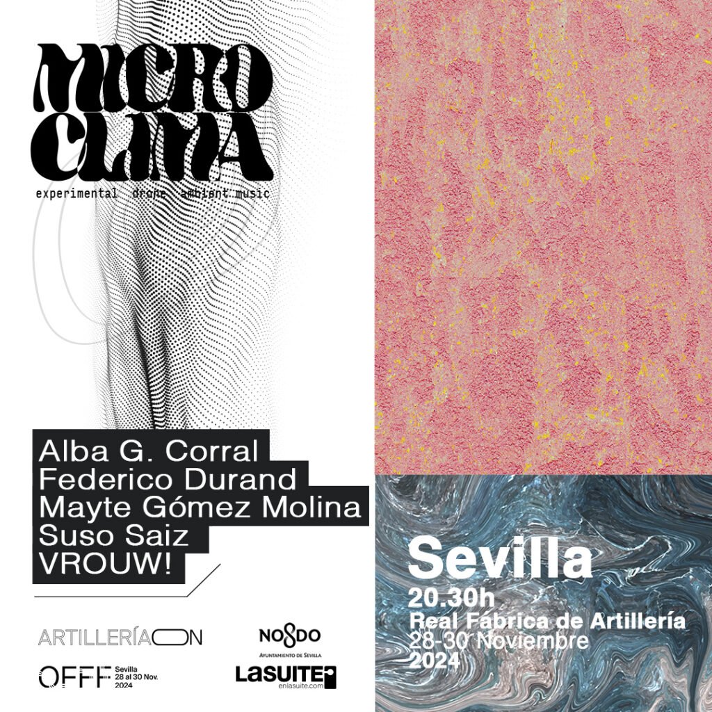 Microclima: Música & Visuales es un ciclo de música experimental encuadrado dentro de OFFF Sevilla 2024 el 28 y 29 de noviembre OFFF Sevilla es un encuentro multidisciplinar para mentes creativas de todo el mundo en el que se dan cita grandes personalidades del arte digital, ya sea del diseño gráfico y sonoro, la realidad virtual e incluso la IA. Se desarrollará del 28 al 30 de noviembre en la Real Fábrica de Artillería de la ciudad hispalense donde habrá inspiradoras charlas, talleres y también una serie de actuaciones musicales plagadas de experimentación con nombres que están a la vanguardia musical. Dentro de este marco se desarrollará Microclima: Música & Visuales, un ciclo comisariado por LaSuite en el que se combina la experimentación sonora con propuestas visuales innovadoras, llevando al público a explorar nuevas formas de arte. El 28 de noviembre a las 21:30h, los artistas Suso Saiz y Alba G. Corral ofrecerán una propuesta que integra música ambiental y visuales en tiempo real, creando una atmósfera envolvente que conecta la mente con los sentidos. Saiz, pionero de la música ambiental en España, y Corral, conocida por su trabajo con tecnologías digitales y visuales que ha presentado en festivales como Sónar, Mutek y LEV, ofrecerán una experiencia única de fusión entre el sonido y la imagen. El 29 de noviembre a las 20:30h, Federico Durand y Mayte Gómez Molina presentarán una actuación que combina lo sonoro y lo visual desde una perspectiva experimental. El músico argentino Federico Durand, conocido por sus creaciones introspectivas, utiliza melodías mínimas y repetitivas que crean espacios de ensueño, evocando la vida secreta de los jardines a través de una mezcla de lira, cajitas de música, cassettes y sintetizadores. Junto a Mayte Gómez Molina, ofrecerá una reflexión única que une la tecnología con el arte, creando una atmósfera que invita al público a un viaje sensorial único. Para hacerte con tus entradas consulta la web de OFFF Sevilla.