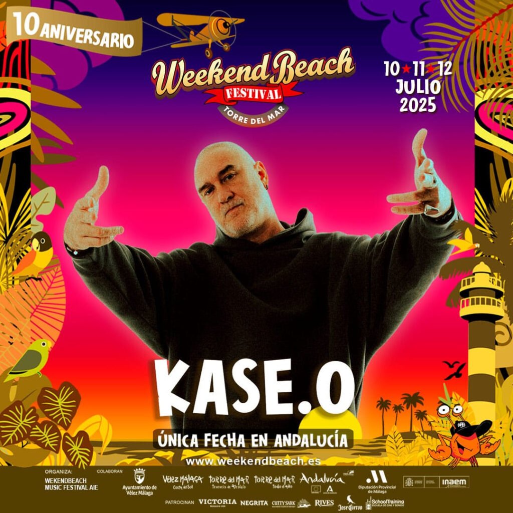 El artista zaragozano que vuelve a los escenarios en 2025 con muy pocos shows, dará este único concierto andaluz en el festival malagueño que este año celebra su X Aniversario los días 10, 11 y 12 de julio. Weekend Beach Festival adelanta regalo navideño para todos los fans y amantes del rap en España, KASE O celebrará el X Aniversario del festival de Torre del Mar y su vuelta a los escenarios el próximo mes de julio en la playa malagueña. La cita será los días 10, 11 y 12 de julio como único concierto en Andalucía. Después de un largo periodo de descanso y reflexión, el legendario rapero zaragozano KASE O vuelve a subirse a las tablas y lo hará a lo grande y en riguroso directo, como debe ser. El MC celebrará también sus 33 años de trayectoria en el hip hop siendo uno de los grandes. Un recorrido por los grandes éxitos del rapero desde sus inicios. En Weekend Beach Festival tocará uno de los pocos conciertos que hará en 2025, una cita muy especial donde los weekers podrán disfrutar de sus hits más exitosos de toda su trayectoria, desde su etapa en Violadores del Verso hasta los más recientes. KASE O es hablar de hip hop con mayúsculas, hablar de la historia del rap en nuestro país y mesa allá de nuestras fronteras. Es todo un referente para las nuevas generaciones y un auténtico maestro respetado y admirado. Será una la única ocasión de ver su poderoso directo en Andalucía y será en Torre del Mar. _____________________________________________________________________ Este gran encuentro que acoge a weekers de todas las generaciones y gustos musicales, recibió el año pasado 75.000 asistentes y tuvo un impacto económico de más de nueve millones de euros siendo uno de los festivales más importantes de España. Torre del Mar está ubicado en pleno corazón de la Costa del Sol, es un marco turístico único con playas certificadas con la Bandera Azul y la Q de Calidad Turística, lo que hace que los weekers disfruten de un entorno espectacular. Artistas años anteriores: Europe, Steve Aoki, Melendi, Mora, Maluma, Mando Diao, Nicky Jam, Bastille, Black Eyed Peas, Ozuna, Becky G, The Original Wailers, The Offspring, Skrillex, David Guetta, The Prodigy, Hardwell, Sepultura, Jimmy Cliff, Residente, Los Fabulosos Cadillacs, Nada Surf, Nervo, Damian Marley, Alborosie, The Toy Dolls, Vetusta Morla, Bunbury, Ska-P, Luz Casal, Lori Meyers, Rozalén, Love of Lesbian, Izal, Fangoria, Rosendo, Juanito Makandé, Estopa, Sfdk, Kase O, Rozalén, Loquillo, Chambao, Macaco, Mala Rodriguez, Rosendo, Mago de Oz, Fuel Fandango, La M.o.d.a, La Pegatina, MClan, Lola Indigo, Beret, Maka, Coque Malla, Lia Kali y un largo etc. Venta de entradas: www.weekendbeach.es * Torre del Mar está ubicado en pleno corazón de la Costa del Sol (Málaga), es un marco turístico único con playas certificadas con la Bandera Azul y la Q de Calidad Turística, lo que hace que los weekers disfruten de un entorno espectacular. ORGANIZA: WBFT 2025 AIECOLABORAN: AYUNTAMIENTO DE VÉLEZ MÁLAGA y Tenencia Alcaldía TORRE DEL MAR