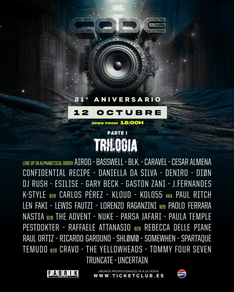 Ya conocemos los horarios y áreas de la 1era de las fechas del Aniversario CODE 2024, el sábado 12 de octubre de 2024 CARTEL COMPLETO CODE OCTUBRE 🚨 Este 12 de octubre comienza la celebración del 21 aniversario de @codebyfabrik a lo bestia Una vez más la marca volverá a proponer un evento para todos los gustos y con todos los sonidos en #FABRIK. Leyendas del #techno como Dj Rush, @len_faki, @lewisfautzi, @nastia.dj b2b @ciscoadvent, @paulatemple o @truncate_la combinados con los sonidos más actuales de @blk.luvs.u, @airod_music, @basswell, @caravel__, @wearekloud, @lorenzoraganzini B2B @paoloferrara_official o @shlomo_taapion. ¡Y mucho MUCHO más! 🏋🏻🥵 ENTRADAS e INFO