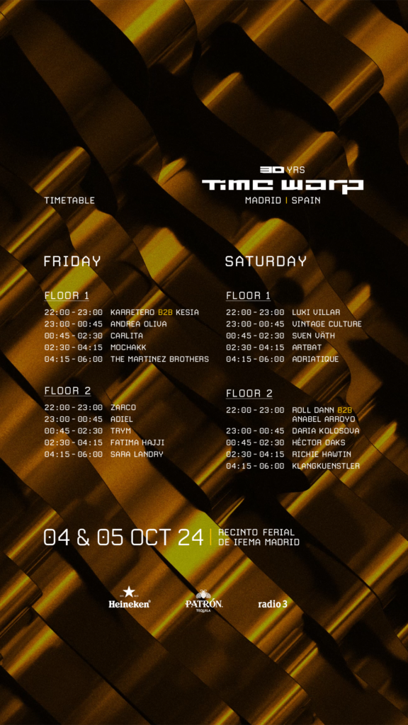 Primera edición en Madrid, viernes 4 y sábado 5 de octubre en el Recinto Ferial de IFEMA MADRID Time Warp ya está aquí. Una primera edición del festival alemán en su 30 aniversario, debutando en España en octubre. Time Warp presenta los horarios oficiales para ambos escenarios, en los Pabellones 12 y 14 del Recinto Ferial de IFEMA MADRID. Marca emblema del techno, Time Warp presentará la programación simultánea en dos escenarios bajo un mismo denominador común, enfocado a la pista de baile. Dos intensos días que convertirán Madrid en capital de la electrónica en el Recinto Ferial de IFEMA MADRID. Los sets se sucederán a un ritmo vertiginoso en dos pabellones independientes. Un montaje de primer nivel que ultima sus detalles para su puesta en marcha el próximo viernes 4 de octubre. El viernes 4 de octubre Time Warp arranca su primera edición con un line up excepcional en ambos stages. El Pabellón 12 arrancará con el set combinado de Karretero B2B Kesia, para dar paso a nombres internacionales como Andrea Oliva o Carlita. A partir de las 02.30 subirán al escenario pesos pesados como Mochakk o The Martinez Brothers. El sonido techno más visceral tomará el Pabellón 14 del Recinto Ferial de IFEMA MADRID, que arrancará con Zarco. Los sets de Adiel o Trym se sucederán, dando paso a Fatima Hajji, que junto con Sara Landry, que clausurará la noche, llevarán este escenario al borde de la locura. El sábado 5 de octubre, Time Warp Madrid arrancará en su Pabellón 12 con Luxi Villar. Será sucedido por Vintage Culture y por un arsenal de primeros espadas como Sven Väth, seguido del techno melódico de Artbat. El set final de este escenario será protagonizado por Adriatique. El techno más raw de la jornada de nuevo se concentrará en el Pabellón 14 del Recinto Ferial de IFEMA MADRID. Tras el opening de Roll Dann B2B Anabel Arroyo, el sonido de Daria Kolosova tomará el relevo en el escenario. El madrileño Héctor Oaks invadirá la cabina pasada la medianoche. Los dos últimos sets en este escenario serán los más esperados, con artistas referentes en la escena mundial como Richie Hawtin o el set final de la mano de Klangkuenstler, creador del sello Outworld. Una producción de alto nivel que desplegará su primera edición en la capital en octubre 2024. Un line up de vértigo, junto a las últimas innovaciones sostenibles y tecnológicas en dos pabellones independientes del Recinto Ferial de IFEMA Madrid el viernes 4 y sábado 5 de octubre.
