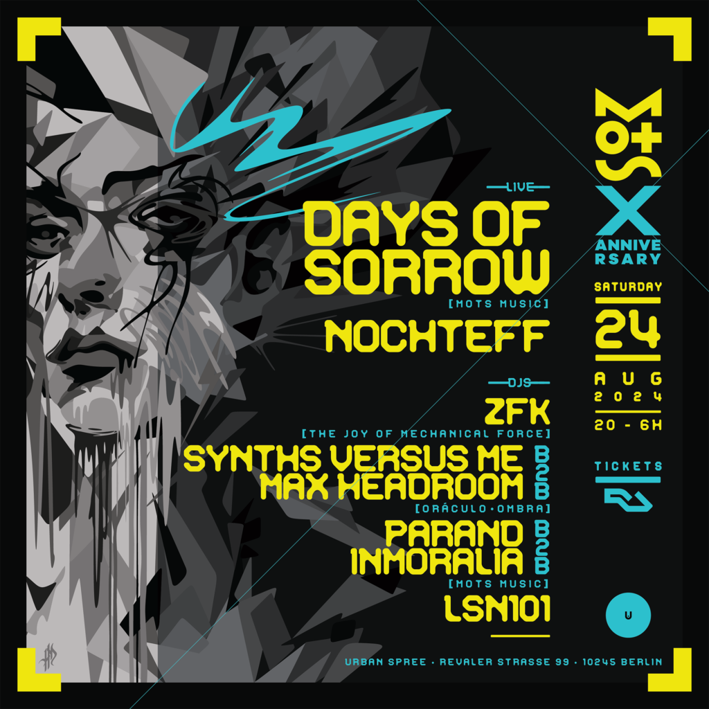 A lo largo de 2024, esta casa, Mots Music, está de celebración, ya que cumplimos una década informando sobre la música y la cultura no mainstream. Para nuestro evento en Berlín contamos con la mítica banda de los 80’s, Days of Sorrow, recuperada con tremendo amor hace un par de años por Ombra Festival, grupo que encabeza la celebración de nuestro décimo aniversario el próximo sábado 24 de agosto en la conocida sala Urban Spree. Los germanos no sólo presentarán nuevos temas del álbum que están cocinando a fuego lento, sino también a su nueva teclista, Katharina von Schlotterstein. Himnos como «Firestar», «Wild World» o «I Travel» harán vibrar el escenario berlinés, stage que será testigo de nuevos tracks que la formación se complace en interpretar en exclusiva para este encuentro. Junto a Days of Sorrow, como parte de los directos, estará Nochteff (Mueran Humanos / Dios). El artista de origen argentino afincado en la capital alemana presentará su nuevo proyecto en solitario, abriendo una noche donde no faltarán los djs y la música electrónica pinchada a vinilo, y sólo a vinilo. Y es que es éste formato el que siempre eligen Synths Versus Me (Oráculo Records) y Max Headroom, capos de Ombra Festival, con los que tendremos el placer de contar en nuestra velada electrónica. Así mismo, nuestro décimo aniversario se nutre de artistas locales que también han pasado por Ombra como Annechoic, en esta ocasión junto a Manuela Mayoral bajo el nombre LSN101, o Parand, productora iraní bien conocida por su cuidada selección musical y exquisita forma de mezclar, quien pinchará junto a Inmoralia, antes conocida como From Hell, ideadora de este proyecto que llamamos Mots Music. El catalán ZFK, miembro del colectivo The Joy Of Mechanical Force, será el artista que pondrá el punto industrial y experimental a la noche. Mots Music X Anniversary -Berlin Edition August 24 @ Urban Spree: Revaler Str. 99, 10245 Berlin, Germany Doors Open: 08:00 pm Lives: Days of Sorrow // Nochteff Djs: Synths Versus Me B2B Max Headroom // Parand B2B Inmoralia // LNS101 // ZFK TICKETS Link: I travel – Days of Sorrow