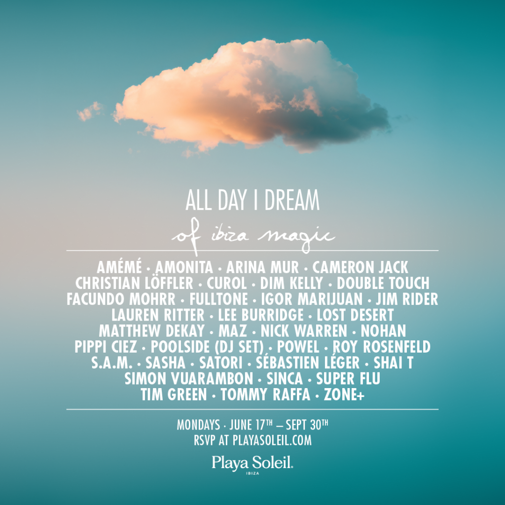 El mítico evento de Lee Burridge estrenará residencia con un line up espectacular donde destacan Nick Warren, AMÉMÉ, Sasha, Satori y Poolside (DJ Set) Una de las fiestas más excitantes de la nueva temporada en Ibiza será sin duda All Day I Dream. El concepto de Lee Burridge se traslada a Playa Soleil durante 16 fechas, del 17 de junio al 30 de septiembre. Además de ser un legendario sello discográfico, All Day I Dream se ha convertido por méritos propios en un ejemplo de diversión y calidad musical desde su nacimiento en 2011 en una azotea de Brooklyn. Este evento es una oda a la alegría, al sonido House, un espectáculo repleto de detalles sutiles y grooves contagiosos. Su creador y gurú, Lee Burridge, estará al frente de esta residencia. Pero no estará solo. Por la cabina de Playa Soleil tendremos la oportunidad de disfrutar de las actuaciones de AMÉMÉ, Amonita, Arina Mur, Cameron Jack, Christian Löffler, Curol, Dim Kelly, Double Touch, Facundo Mohrr, Fullton, Igor Marijuan, Jim Rider, Lauren Ritter, Lost Desert, Matthew Dekay, Maz, Nick Warren, Nohan, Pippi Ciez, Poolside (DJ Set), Powel, Roy Rosenfield, S.A.M., Sasha, Satori, Sébastian Leger, Shai T, Simon Vuarambom, Sinca, Super Flu, Tim Green, Tommy Raffa y Zone+. Sobre su nueva residencia Lee Burridge ha comentado: “El verano en Ibiza ya se nos echa encima rápidamente y este año tenemos el placer de acoger 16 fiestas All Day I Dream en Playa Soleil. ¡Alerta de ubicación fantástica! Estoy deseando lanzar el primer tema de lo que promete ser un verano muy especial”. Si vives o estás en Ibiza del 17 de junio al 30 de septiembre no debes perderte por nada del mundo un evento que magnifica en el espíritu de la isla, porque All Day I Dream en Playa Soleil representa lo mejor del pasado, el presente y el futuro de la Isla Blanca.