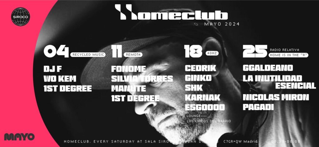 La programación de la sesión de los sábados de Siroco se centra en diferentes propuestas sonoras desde Recycled Music Center hasta 40hz pasando por Remota desde Zaragoza ·DjF, Wo Kem, Fonome, Silvia Torres, Cedrik, Ginko, SHK, Karnak y E5G0000 son los artistas nacionales y locales de un mes que ofrecerá en la electrónica de baile más variada ·La noche de HOME IS IN THE R de Radio Relativa es el colofón con ggaldeano, La Inutilidad Esencial y Nicolás Mirón & Pagadi como invitados Noches cortas pero intensas son norma cuando llega el buen tiempo. En HOME CLUB se conoce bien esta dinámica y los homies que llegan cada sábado noche a la céntrica Sala Siroco saben que tienen un oasis para descubrir las propuestas musicales más serias a la par que hedonistas de la capital. Música electrónica alternativa a cargo de los mejores selectores locales y nacionales en un espacio cercano, acogedor e integrador en el que todo el mundo es bienvenido para desconectar de la cotidianidad del resto de la semana con cuatro fechas en las que artistas y colectivos con discursos sonoros potentes toman el control de la cabina en San Dimas 3. Si eres amante del vinilo, Recycled Music Center es uno de los templos para todos los diggers que visitan la ciudad o viven en ella. Su máximo responsable, el inigualable DjF aterriza en HOME CLUB con las maletas llenas de joyas y tesoros atemporales de su colección personal donde el house, el electro y el techno se entrelazan. Las nuevas generaciones de artistas que respetan y veneran el formato pueden verse representadas en Wo Kem, otro sospechoso habitual de la escena clubber capitalina. El irreductible residente 1st Degree pondrá los ritmos para calentar la jornada del 4 mayo en el refugio perfecto para tus bailes si no te has ido de puente. Boiler Room con DjF como protagonista Con un ojo en San Isidro y otro en La Pilarica, el segundo encuentro del mes concebido para el 11 de mayo es el resultado del junte con la plataforma zaragozana Remota. Una noche en la que los ritmos techno más candentes harán las delicias de los seguidores del género. Una noche en la que se contará con la veteranía del sevillano Fonome, la fuerza y empuje de los breaks de Silvia Torres y la elegancia contrastada de Manute. Redondeando el elenco un 1st Degree para desgastar zapatilla. 40hz es el colectivo que ha revolucionado la escena de la bass deep music durante todo el año en Madrid. Eso se traduce en que HOME CLUB se va a convertir en un aquelarre donde se rendirá culto a los ritmos rotos más efervescentes durante la noche del 18 de mayo. Los chamanes van a ser los sospechosos habituales de esta propuesta con Cedrik, Ginko, SHK, Karnak y E5G0000 incendiando los ánimos. Por si fuera poco, Los Chicos del Barrio (dupla compuesta por Big City Lover y Sheism) comandarán el lounge con una mezcla sónica llena de eclecticismo. El 25 de mayo Siroco será territorio de HOME IS IN THE R. Como cada final de mes con los chicos de Radio Relativa programarán una noche con los artistas más inquietos del panorama local. Un encuentro con los responsables de sus programas radiofónicos con una visión diferente de la música. En esta ocasión ggaldeano, La Inutilidad Esencial (dupla compuesta por Asier Camp y Paaalm8) y Nicolás Mirón & Pagadi repartirán su conocimiento musical para sorprender con joyas ocultas y olvidadas sin importar estilos ni latitudes. Cuatro citas de altas temperaturas musicales para encarar un cierre de temporada de la que se informará próximamente. Consigue tus entradas anticipadas a través de DICE. -PROGRAMACIÓN MAYO 2024- · 4 de mayoRecycled Music Center: DjF + Wo Kem + 1st Degree ENTRADA ANTICIPADA 4 DE MAYO ·11 de mayoREMOTA: Fonome + Silvia Torres + Manute + 1st Degree ENTRADA ANTICIPADA 11 DE MAYO ·18 de mayo40HZ: Cedrik + Ginko + SHK + Karnak + E5G0000Lounge:Los Chicos del barrio ENTRADA ANTICIPADA 18 DE MAYO ·25 de mayoHOME IS IN THE R: ggaldeano + La Inutilidad Esencial + Nicolás Mirón & Pagadi ENTRADA ANTICIPADA 25 DE MAYO SUPPORT UR LOCAL SCENE TODOS LOS SÁBADOS EN SALA SIROCO (Calle San Dimas 3) DE 00:30h a 6hPrecio de entradas en puerta: 16 Euros