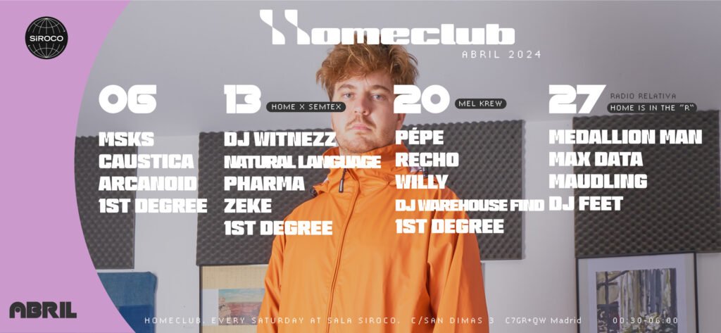 ·La vieja y la nueva escuela tienen cabida en la sesión los sábados noche de Siroco con veteranos como MSKS, Caustica y Arcanoid junto a artistas pujantes del colectivo granadino Semtex o la plataforma valenciana Mel como protagonistas ·HOME IS IN THE R de Radio Relativa cierra el mes con la presencia de Medallion Man b2b Max Data y maudling b2b DJ Feet Después de una Semana Santa sin mucho recogimiento, porque quien acude a HOME CLUB es disfrutón por naturaleza, se anuncian las noches de los sábados en la Sala Siroco. Abril se encara con la misma energía que hace destacar a la sesión dentro de la escena clubbing madrileña: una apuesta por el talento nacional con artistas para los que la electrónica es su pasión, independientemente de la experiencia que tengan. Un mes que será un punto de encuentro intergeneracional en busca de una diversidad musical donde la calidad siempre prima por encima de todo. La noche del 6 de abril HOME CLUB recibe a veteranos con una dilatada carrera y sapiencia musical a los platos con el techno vigoroso y el electro pegajoso como puntos fuertes. Una cita en la que también tiene cabida la influencia detroitiana, el house más ácido o el EBM más rabioso. Todo ello a manos de MSKS, Caustica y Arcanoid. Tres nombres que son historia viva de la escena madrileña más underground. Streaming de MSKS para Dirty Sonora El colectivo Semtex se alía con HOME CLUB el 13 de abril para hacer explotar la euforia con los ritmos más insospechados. Nuevas generaciones que vienen pisando fuerte desde Granada con Natural Language a la cabeza en un b2b con DJ Witnezz. También en formato b2b se presentan Zeke y Pharma para embutir de energía a toda la pista. 1st Degree como residente completa el cartel. Valencia siempre ha sido sinónimo de vanguardia y los chicos de MEL hacen honor a una visión de la música de baile que va un poco más allá, pero sin perder el pulso a la pista. Ya saben lo que es liarla en HOME CLUB y regresan con ganas con prácticamente todo su equipo titular: Pépe, Recho, Willy y DJ Warehouse Find. Redondeando la noche el residente 1st Degree dará su toque personal. Abril llega a su fin con HOME IS IN THE R en colaboración con Radio Relativa. Una noche donde el formato B2B toma su protagonismo con artistas internacionales como el británico Medallion Man desde el sello Loose Lips que compartirá cabina con su compatriota Max Data todo un experto en breaks que ha demostrado su valía en Datacentre y Wyrd Wrld. Desde Madrid maudling b2b DJ Feet pondrán más salsa con su electrónica sugerente y cargada de groove. Abril es un mes para disfrutar con la mejor electrónica en HOME CLUB. Consigue tu entrada anticipada a través de DICE. -PROGRAMACIÓN ABRIL 2024- ·6 de abril MSKS + Caustica + Arcanoid ENTRADA ANTICIPADA 6 DE ABRIL ·13 de abrilSEMTEX x HOME: Dj Witnezz B2B Natural Language + Pharma B2B Zeke + 1st Degree ENTRADA ANTICIPADA 13 DE ABRIL ·20 de abrilMEL KREW: PÉPE + RECHO + WILLY + DJ WAREHOUSE FIND + 1st Degree ENTRADA ANTICIPADA 20 DE ABRIL ·27 de abrilHOME IS IN THE R: Medallion Man b2b Max Data + maudling b2b DJ Feet ENTRADA ANTICIPADA 27 DE ABRIL SUPPORT UR LOCAL SCENE TODOS LOS SÁBADOS EN SALA SIROCO (Calle San Dimas 3) DE 00:30h a 6hPrecio de entradas en puerta: 16 Euros