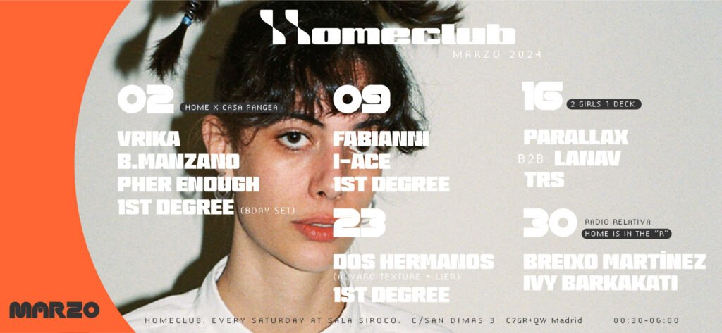 El colectivo Casa Pangea, Fabianni y I-ACE desde Agorazein, 2 girls 1 deck con TRS y un B2B entre Parallax y Lanav; y la formación Dos Hermanos protagonizan las noches de marzo de la sesión los sábados en Siroco ·HOME IS IN THE R de Radio Relativa cierra el mes con la visita desde Barcelona de Breixo Martínez e Ivy Barkakati La primavera la sangre y el ritmo altera. En HOME CLUB florece la vitalidad para convertir las noches de los sábados de la Sala Siroco en un encuentro con la música más inquieta de la escena electrónica. Un mes de marzo plagado de variedad musical con un marcado espíritu acogedor para dar cobijo al talento local y nacional con discursos con personalidad propia. Un espacio seguro e inclusivo donde se crea la mejor atmósfera de club de la capital para todos aquellos que disfrutan de sonidos más frescos y crujientes del panorama realmente underground. La noche del 2 de marzo HOME CLUB recibirá la visita de Casa Pangea, el colectivo de gallegos afincados en Madrid que está sorprendiendo con eventos en los que el techno, el electro y los breaks se conjugan de manera exquisita. Vrika, Borja Manzano y PHer Enough van a comandar una cita musical con imaginativas sesiones que harán justicia a su leitmotiv principal: No Bad Trips. A eso hay que sumar al residente 1st Degree que ofrecerá una sesión muy especial. Todos sabemos que AGZ es para siempre y dos de los integrantes detrás de los beats de uno de los colectivos más importantes de la escena urbana del país aterrizan en HOME CLUB el 9 de marzo para mostrar su lado más clubbing. Fabianni e I-Ace, este último también miembro de Antifan, sacarán su talento para rebuscar entre joyas de un electro cargado de funky y sonidos house plagados soul. Un encuentro con el groove al que también se apunta 1st Degree para completar el cartel. Entre la experimentación, la deconstrucción y la música para quemar zapatilla llega la propuesta 2 girls 1 deck el 16 de marzo con su alma máter a la cabeza TRS para ofrecer una amalgama de ritmos llenos de eclecticismo de breaks y dub. Además, será una noche para ver una conexión Madrid-Barcelona inédita con Parallax y Lanav demostrando vinilo a vinilo una técnica y lectura de pista envidiable para hacer sudar al respetable. Potencia al cubo. Esperar lo inesperado es probablemente lo que ocurra el próximo 23 de marzo en HOME CLUB con la presencia de Dos Hermanos, se trata del junte entre Álvaro Texture junto a Javi Lier. El núcleo duro de Egotrip en cabina puede llevarnos por los caminos más insondables de la electrónica de baile más arriesgada. El residente 1st Degree no se lo pierde y aportará su granito de arena en una noche de puro derroche. Se cierra el mes apurando la Semana Santa con HOME IS IN THE R en colaboración con Radio Relativa que cogen el puente aéreo trayendo a dos reputadas figuras de la escena barcelonesa como son Breixo Martínez e Ivy Barkakati. El primero, conocido por el sello y radioshow Canela en Surco y formar parte de la crew de Discos Paradiso, ofrecerá una degustación sonora de las joyas atemporales que esconde en su maleta. La segunda es puro carisma y energía a la hora de generar mutaciones sonoras entre el house, el soul, el funk y el disco. No se asegura que el domingo haya resurrección después del sábado 30 de marzo con tanto baile y groove bien armado. Marzo es un mes para disfrutar de los primeros bailes primaverales en HOME CLUB. Consigue tu entrada anticipada a través de DICE. -PROGRAMACIÓN MARZO 2024- ·2 de marzoCASA PANGEA: Vrika + B.Manzano + Pher Enough + 1st Degree ENTRADA ANTICIPADA 2 DE MARZO ·9 de marzo Fabianni + I-Ace + 1st Degree ENTRADA ANTICIPADA 9 DE MARZO ·16 de marzo2GIRLS 1DECK: Parallax b2b LANAV + TRS ENTRADA ANTICIPADA 16 DE MARZO ·23 de marzoDos Hermanos + 1st Degree ENTRADA ANTICIPADA 23 DE MARZO ·30 de marzoHOME IS IN THE R: Breixo Martínez + Ivy Barkakati ENTRADA ANTICIPADA 30 DE MARZO SUPPORT UR LOCAL SCENE TODOS LOS SÁBADOS EN SALA SIROCO (Calle San Dimas 3) DE 00:30h a 6hPrecio de entradas en puerta: 16 Euros