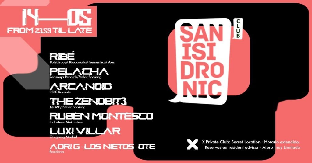 Fuente RRSS San Isidronic Este San Isidro volvemos a nuestra esencia Club más pura con una selección “Made in Madrid” . Sonido Function One, 2 zonas y horario muy extendido en el mejor “Secret Location” de Madrid. El aforo es muy LIMITADO, sólo pondremos unas pocas entradas anticipadas en promo a 15€ en https://sales.premiumguest.com/…/san…/san-isidronic/ El próximo domingo 14 de Mayo (víspera de festivo) tenemos una cita íntima en San Isidronic X Private Club con nuestros Local Heroes : Ribé Pelacha Dejota #Arcanoid The Zenobit3 Ruben Montesco Luxi Villar Adri G # Los Nietos Ote