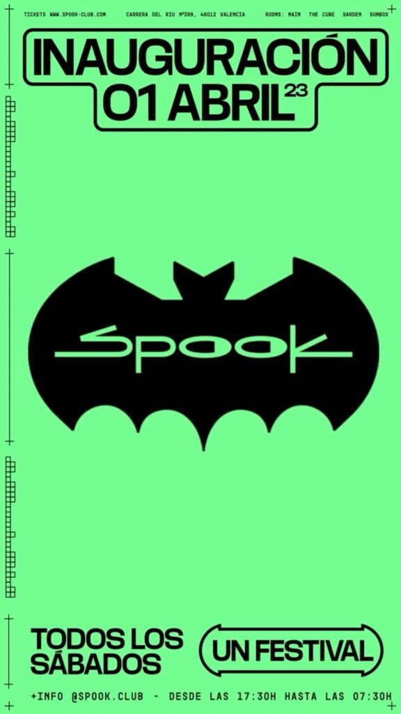 Vuelve el murciélago al templo, vuelve Spook.Desplieguen las alas, vamos a volar más alto que nunca. Los mejores Dj´s, Lives y bandas del underground, tanto nacionales como internacionales. Una selección exquisita que va desde el techno, al post punk, pasando por el house o el urban. Jornadas de sol a sol, desde las 18:00hs a las 7:00hs, con terrazeo, Foodtrucks y mucho más. #TodosLosSábadosUnFestival. 5 sabados de auténtica locura en el club valenciano con nombres de un alto nivel. El dúo Boston 168, Adiel, Helena Hauff, Pawsa, Apollonia o Fjaak encabezan el Line Up de todos estos sabados de buena música y mucho baile en el club de la costa mediterránea. Entradas disponibles en: https://spook-club.com/tickets/#/events SOBRE SPOOK: En 1984 sobre las cenizas de la discoteca San Francisco voló por primera vez el murciélago más emblemático de la noche. Abría Spook Factory, el templo de la música Valenciana.Un espacio para la experimentación sensorial que marcó un antes y un después en la historia del clubbing.Hoy Spook sigue siendo historia viva de Valencia, ofreciendo una programación musical de vanguardia nacional e internacional.SPOOK es historia viva de Valencia desde 1984. El templo de la música, la catarsis y la vanguardia valenciana.Situado junto al mar Mediterráneo, a tan solo 10 minutos de la ciudad, cuenta con 10.000m2, una terraza con vistas al mar y cuatro espacios totalmente equipados y conectados entre sí. Fuente: Instagram Oficial de Spook Club – Web Oficial https://www.instagram.com/p/Cpc0m61tVUc/?utm_source=ig_web_copy_link