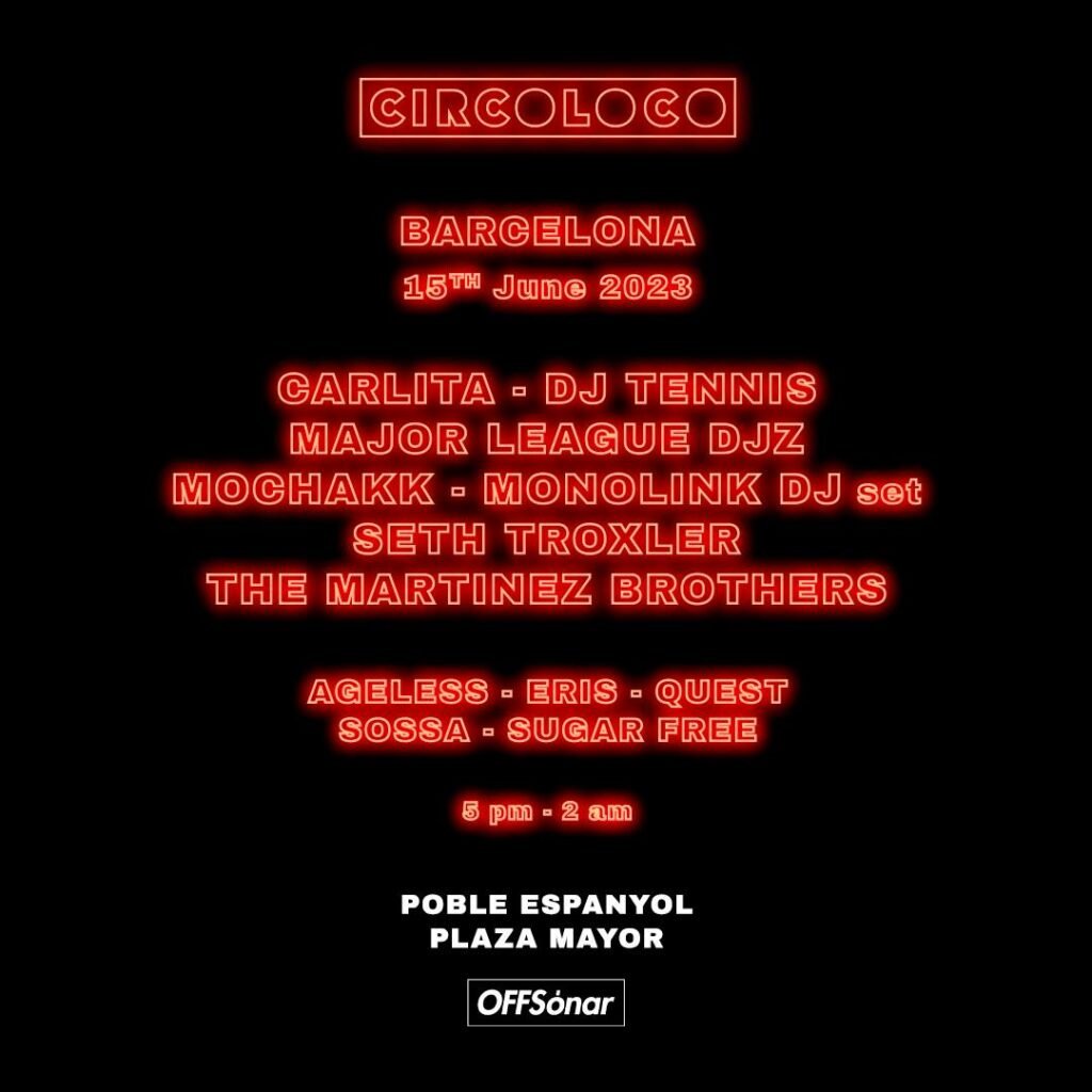 Circoloco vuelve al Poble Espanyol el próximo jueves 15 de Junio con motivo de la OFF WEEK 2023. Un line up cargado de artistas de talla internacional y con habituales de la fiesta con base en Ibiza. Seth Troxler, The Martinez Brothers o Dj Tennis, entre otros, pasarán por la Plaza Mayor del recinto de la capital condal en horario vespertino de 5pm a 2am. Ya esta disponible el pre-registro a partir de hoy Martes 21 en el siguiente enlace: https://link.dice.fm/cc3a905ca810