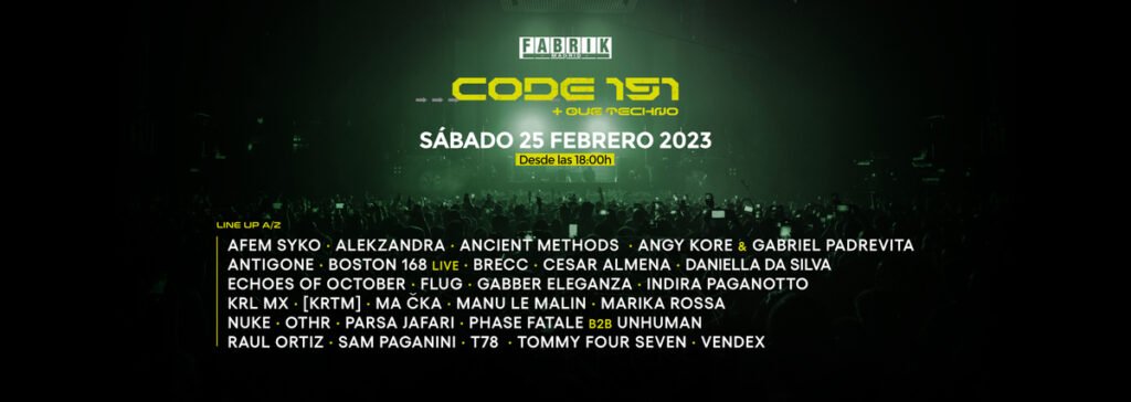 HORARIOS CODE 151 Sábado 25 febrero en Fabrik