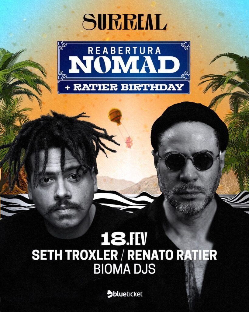 ¡ Nuestro querido Nomad está a punto de ser reabierto! Quienes se la perdieron o incluso quienes no tuvieron la oportunidad de bailar en esa pista podrán honrar el sábado 18 su reapertura, mejorada y lista para recibirlos.¡Hubo innumerables momentos mágicos vividos en Nomad , el favorito de muchos! La pista con aire veraniego y carnavalero , que ofrece el amanecer más hermoso de la región , no pudo ser reabierta en mejor ocasión: en la primera noche de Surreal Carnival, celebrando el cumpleaños de nuestro creador , al son de Seth Troxler , Renato Ratier . y Bioma DJ .¡Vivir el amanecer en la reapertura de Nomad con la banda sonora elegida con cariño por este equipo será una experiencia única! ¡No te lo pierdas! ¡Y hay varias opciones para aquellos que quieran asistir a Surreal Carnival 2023 ! Contamos con boletos individuales para cada fecha, pasaporte para los 3 días, reservas de mesas y camarotes y para complementar abrimos la venta de boletos Meia Social y Consumación Individual para los días 19 y 20. Media social : Compra directa a través de la página web y presentación imprescindible de 1 kg de alimentos no perecederos a la entrada del evento.Consumación: Compra directa a través del sitio web y retiro de la tarjeta de consumación al validar boletos. (Importe 100% consumido excepto cuota Blueticket) ENTRADAS