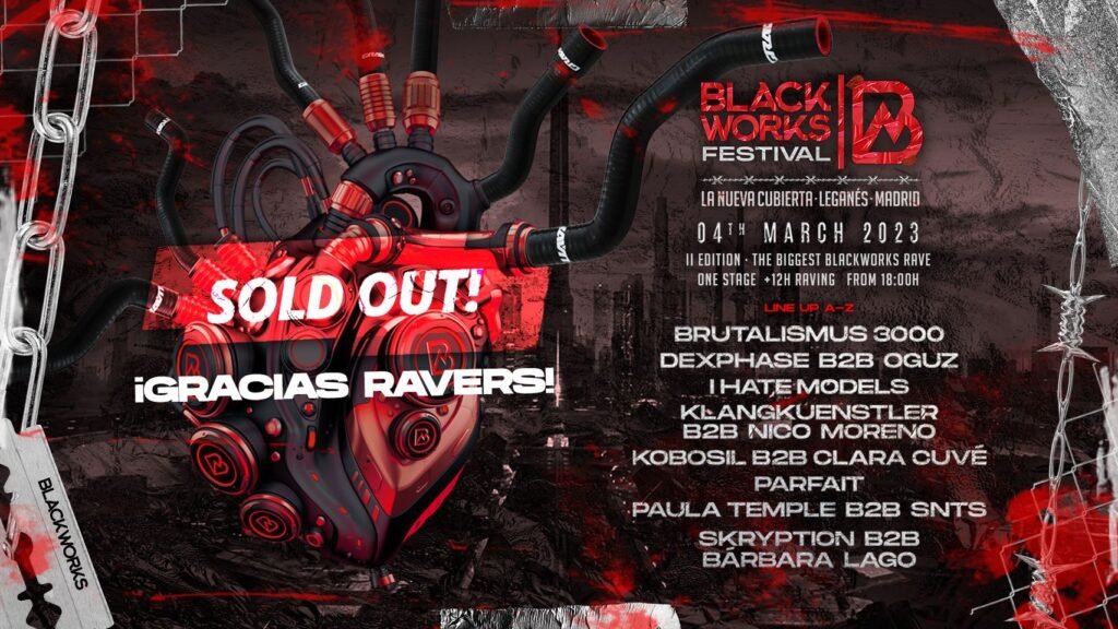 Más de 12 horas de raving, con más de 14 artistas repartidos en 5 B2B y con cerca de 10.000 ravers en la Cubierta de Leganés; un escenario épico para la marca madrileña El próximo 4 de Marzo aterriza en la Cubierta de Leganés, la segunda edición del Blackworks Festival una rave a grandes dimensiones con más de 12 horas de baile plagado de artistas nacionales e internacionales. El line up lo conforman el dúo Brutalismus 3000, el enérgico I Hate Models y Parfait en formato de dj set individual. La gran sorpresa de esta edición viene dada por los distintos B2B que pasarán por la cubierta a lo largo de la noche. Desde el esperado SNTS back to back Paula Temple, al Kobosil y Clara Cuvé y Dexphase con Oguz. Otra de las actuaciones más romperadoras la protagonizarán Klangkuenstler y uno de los más habituales en Blackworks, Nico Moreno; que formarán pareja en este elenco de artistas en formato back to back. No podía faltar el talento nacional de Bárbara Lago con varias visitas a sus espaldas a los amigos de Blackworks y una de las referencias raving de la marca, Skryption; un dúo que hará explotar el recinto madrileño con el mejor hard del momento. Desde las 18:00 del mismo 4 de Marzo, los ravers invadirán la Cubierta en esta segunda edición del Blackworks Festival que 40 días antes ha colgado el cartel de SOLD OUT! Fuente: https://blackworksfestival.com/madrid/ https://www.facebook.com/events/936245580695737