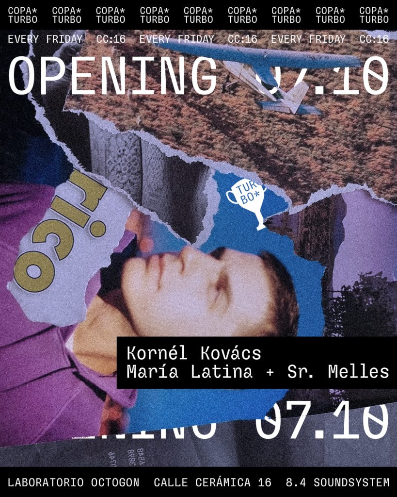 El estreno de CC:16 tendrá lugar el próximo viernes 7 de octubre con Copa Turbo, nuevo proyecto de Depaart – también creadores de Tortilla y Fluido – que contará con el sueco Kórnel Kóvacs como invitado de excepción. ●CC:16 nace para proveer de contenido artístico Laboratorio Octogon, en el que se promociona y testea la patente de sonido 8.4, única en su especie y que lo posiciona a la vanguardia del sonido internacional.Copa Turbo se desarrollará todos los viernes en horario extendido al más puro estilo berlinés y de aquí a noviembre recibirá la visita de destacados artistas invitados internacionales. El primero de ellos será Kórnel Kóvacs el próximo viernes 7 de octubre. Este DJ y productor sueco, fundador del respetado sello discográfico Studio Barnhus, ocupa uno de los lugares más destacados del circuito electrónico contemporáneo. Le seguirán Lis Sarroca, Laurence Guy, Third Son, CC:Disco! y los mismísimos Depaart que exprimirán al máximo el 8.4 con un directo para el que están preparando su despliegue musical más ambicioso hasta la fecha. El otoño inicia una nueva temporada en la escena electrónica madrileña que llega con importantes novedades. Laboratorio Octogon, un espacio único en la ciudad gracias a la utilización de su patente audiovisual 8.4, estrena nueva propuesta artística. CC:16 se presenta ante todo como un espacio para escuchar, encontrarse y experimentar. El objetivo es promocionar y testear su patente de sonido 8.4 con integración de visuales octogonales a través de diferentes experiencias reales. Por ello, la disposición de la cabina o el escenario, así como la marca y cualidades de los altavoces instalados y los niveles máximos de presión y rendimiento del equipo en el espacio cambiarán constantemente. Lo harán en base a diferentes métricas obtenidas tanto a través de datos técnicos como del feedback del público asistente y de los artistas. Y lo que es aún más importante, el propio espacio se ha adaptado para esta nueva temporada con una serie de mejoras que harán que el sonido de la sala brille como nunca. Los eventos tienen la ambición de crear la mejor experiencia acústica de la ciudad. Completan la programación de octubre/noviembre en Copa Turbo los talentos nacionales: 2Garlics, Betamax, Danny B, Daniel Träumt, Fernanda Arrau, Glossy Mario, John Machete, Kempin, Kresy, Manu Certain, María Latina, Mari.Te, Pablo Ruizgalan, Paul Rudder, Sr. Melles, Two Ex y Vicente. Y además, el 29 de octubre CC:16 contará con nada más y nada menos que con Cassette Club en formato especial. Entradas disponibles para Copa Turbo aquí.