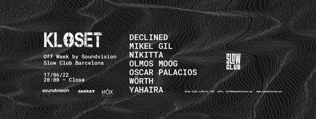 Con DJS como Declined, Tensal, Mikel Gil, Nikkita, Olmos, etc.La promotora Kloset regresa por la puerta grande con dos citas ineludibles para losamantes de la mejor electrónica underground. La primera de ellas, de la mano deSoundvision, tendrá lugar el próximo viernes, 17 de junio, en el marco de la Off Week 2022,en el Slow Club de Barcelona, situado en el Carrer de París, número 186. Desde las 20.00h.EN BARCELONA, CON DECLINED, MIKEL GIL, NIKKITA, OLMOS, ETC.Para dicha fiesta han confirmado un cartel de lujo sonoro en el que destaca la presencia deDeclined, Mikel Gil, Nikkita, Olmos (Moog BCN), Óscar Palacios, Wörth y Yahaira. Sin dudaun line-up de auténtica excepción techno para una noche para recordar.EN MADRID, CON TENSAL, MIKEL GIL, OLMOS Y REITZETras este bombazo en la ciudad condal, Kloset desembarcará en Madrid, el próximo viernes8 de julio, en la sala MUV. Para esta segunda cita, con el mejor sonido techno, el cartel loconforman Tensal, Mikel Gil, Olmos (Moog BCN) y Reitze (Skin Club). Desde las 00.00h yhasta las 9.00h.Se trata de dos citas con las que Kloset afronta, tras dos años de parón pandémico, unfuturo que invita a soñar con aquellas añoradas madrugadas de techno de muchos quilates,oriundos y foráneos, que aparecen de nuevo en el horizonte de nuestras mejoresmadrugadas.KLOSET, FINALISTA EN LOS VICIOUS MUSIC AWARDS EN ‘FIESTAS -500’Recordemos que Kloset, en los Vicious Music Awards en su última edición de 2019, se situóentre las mejores tres “Fiestas -500” de España y toda Latinoamérica.+INFO:https://www.facebook.com/klosetundergroundpartyhttps://www.enterticket.es/eventos/off-week-by-soundvision-kloset-146189https://www.enterticket.es/eventos/kloset-madrid-1st-edition-463133