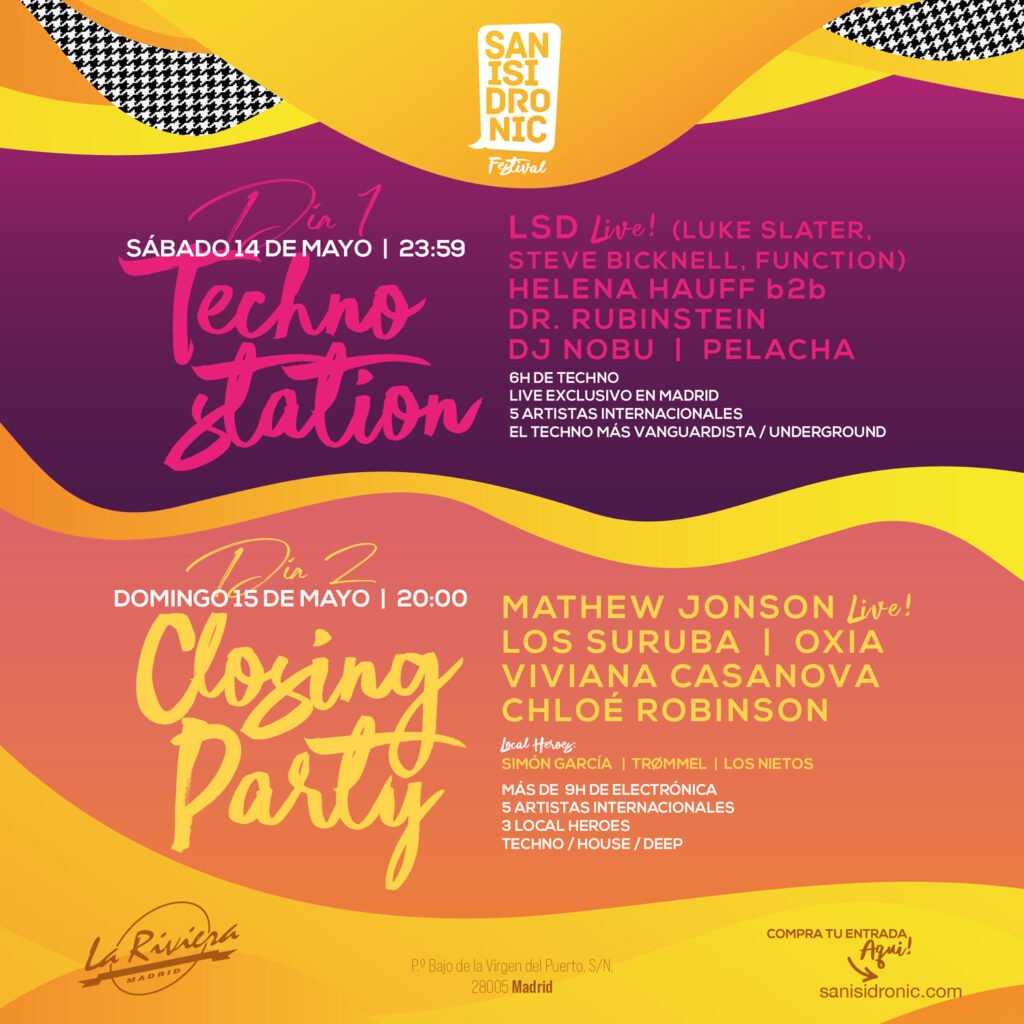 MADRID, 29/04/2022 – San Isidronic se celebrará finalmente en la sala La Riviera los días 14 y 15 de mayo manteniendo la totalidad del cartel presentado. El festival se había anunciado para tener lugar en IFEMA FERIA DE MADRID, pero llenar dos pabellones del recinto ferial ha resultado ser un desafío demasiado costoso para una marca joven que ha irrumpido con una propuesta musical novedosa para la fiesta patronal de Madrid. En La Riviera, San Isidronic va a encontrar la escala idónea para ofrecer un festival de dos días con música Techno de calidad a cargo de artistas internacionales de gran prestigio. Además, con el traslado el evento se aproxima al centro de Madrid. Acercar el emplazamiento al corazón de las celebraciones del día de San Isidro había sido una insistente petición de los usuarios a través de las redes sociales. Los tickets comprados hasta ahora serán válidos automáticamente para las dos noches de evento, los días sábado, 14 de mayo; y domingo, 15 de mayo. Las nuevas entradas costarán 14,90€ (un día) 25€ (abono de dos días). Venta online de tickets:http://ow.ly/3Z6i30sit0m : Sábado 14, Techno Station. Horario: De 23:59 a 6.00LSD live (Luke Slater, steve bicknell, Function) (Madrid Exclusive show 2022)HELENA HAUFF B2B Dr. Rubinstein (Exclusive San Isidronic Set)DJ NOBU (OFFICIAL)Pelacha Dejota Domingo 15, Closing Party. Horario: De 20:00 a 6:00Mathew Jonson LiveLos SurubaOXIAViviana CasanovaChloé RobinsonLocal Heroes:Simon GarciaTrømmelLOS NIETOS