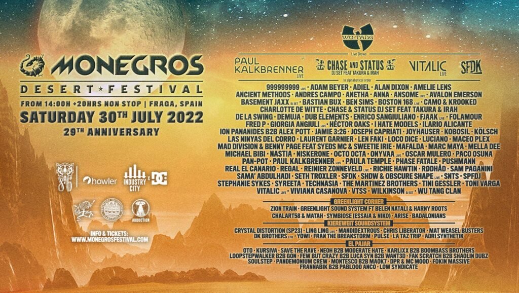 Más de 125 artistas repartidos en 11 escenarios, harán temblar la edición más mítica, creativa y grande de Monegros hasta la fecha. Ya somos más de 45.000 ravers los que bailaremos en el desierto, así que si no tienes entrada, ha llegado el momento de comprar tu pasaporte para la experiencia más extrema del año en monegrosfestival.com ¡No puedes perdértelo!———-HERE’S THE FULL LINE UP OF MDF2022!!More than 125 artists playing in 11 stages will rock the most epic, creative and largest edition of Monegros to date. We are already more than 45,000 ravers who will dance in the desert, so if you don’t have a ticket, the time has come to buy your passport for the most extreme experience of the year at monegrosfestival.com. You can’t miss it! Tickets, VIP and Bus on sale at www.monegrosfestival.comMonegros Desert Festival30th July 2022 from 14:00+125 Artists+20h Festival11 StagesFraga, Spain#MDF2022Fueled by 8.6 Por fin volvemos a Monegros! Una ciudad efímera de más de 50.000 habitantes que cobrará vida durante 24h… ¡Un oasis artístico en el desierto, donde vivirás una experiencia Radical, Auditiva, Visual, y Experiencial jamás vista antes! ¿Estás preparado para la aventura de tu vida?❤️🔥—–We are back in Monegros! An ephemeral city of more than 50,000 inhabitants that will come to life for 24 hours… An artistic oasis in the desert where you will live a Radical, Audio-Visual, and Experiential experience like never before! Are you ready for the adventure of your life?❤️🔥 Tickets, VIP and Bus on sale at www.monegrosfestival.com#MDF2022Fueled by @86beer_es #experiential#ephemeral#festival#arts#techno #360 #rave
