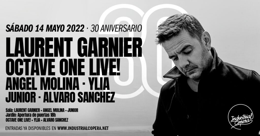 Sábado, 14 de mayo de 2022Aniversario Industrial Copera. 30 años bailando junt@sLAURENT GARNIEROCTAVE ONE Live!ANGEL MOLINAYLIAJUNIORALVARO SANCHEZEntradas disponibles:Entrada show especial El Jardín + nocheA partir de las 18:00 horasAforo muy limitado28€ + gastos de gestión + obsequio especial 30AniversarioEntrada general nocheA partir de las 00:00 horas22€ + gastos de gestión + obsequio especial 30Aniversario