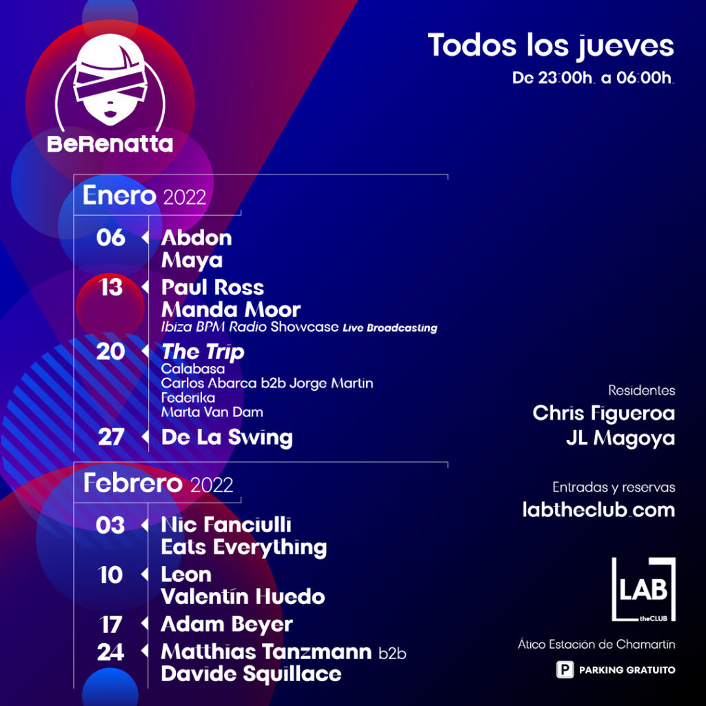 | BeRenatta anuncia los confirmados para los meses de enero y febrero, con grandes nombres y propuestas interesantes como la ofrecida por The Trip, para las diferentes noches de los jueves en LAB theClub, ubicada en el Ático de la Estación de Chamartín. |