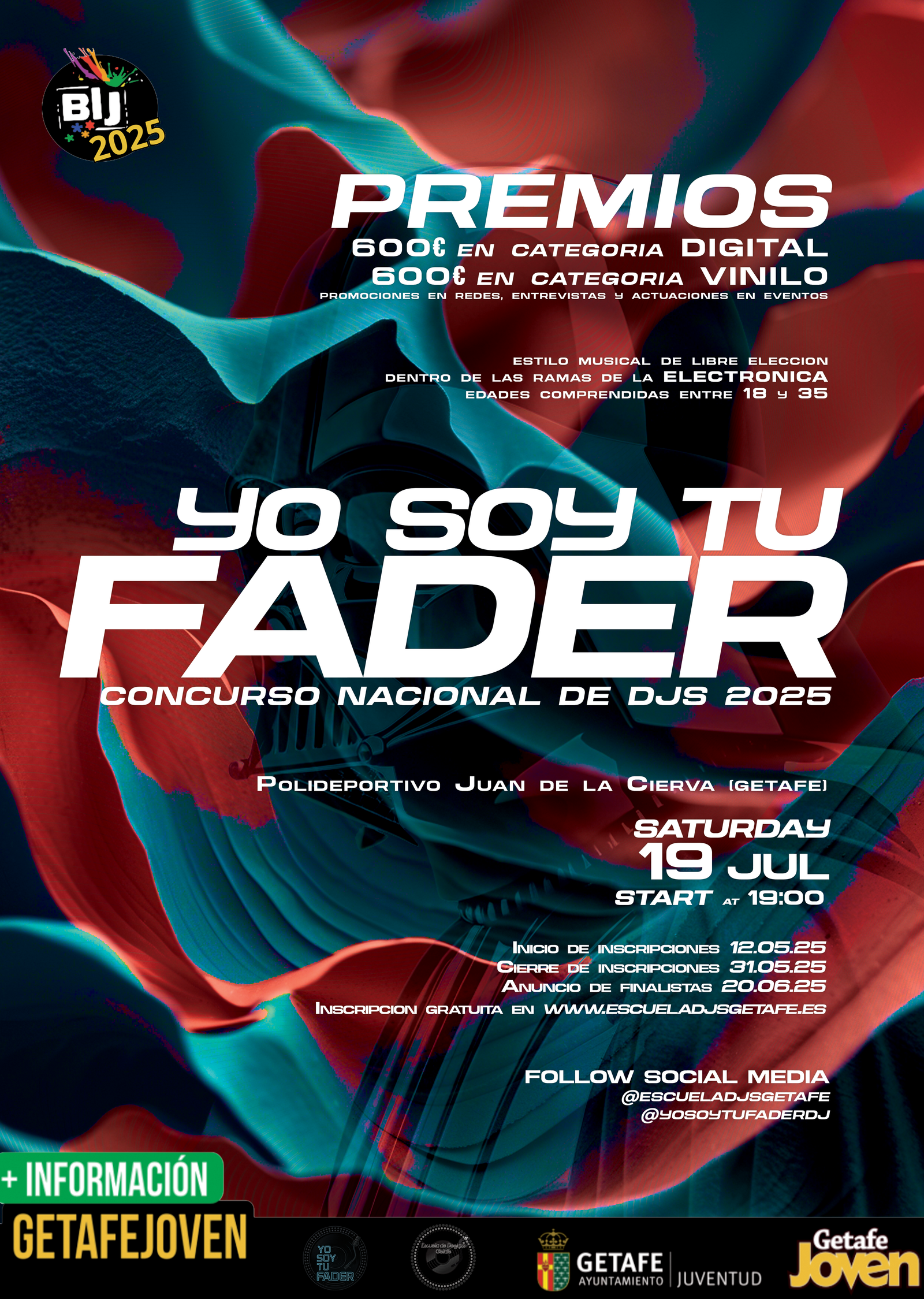 La Escuela de Deejays de Getafe, en colaboración con la Asociación Española de Deejaysy Productores (AEDYP), presenta la edición 2025 del concurso nacional de Deejays “YoSoy Tu Fader”.Esta iniciativa, enmarcada en la Bolsa de Iniciativas Juveniles (BIJ2025) de laDelegación de