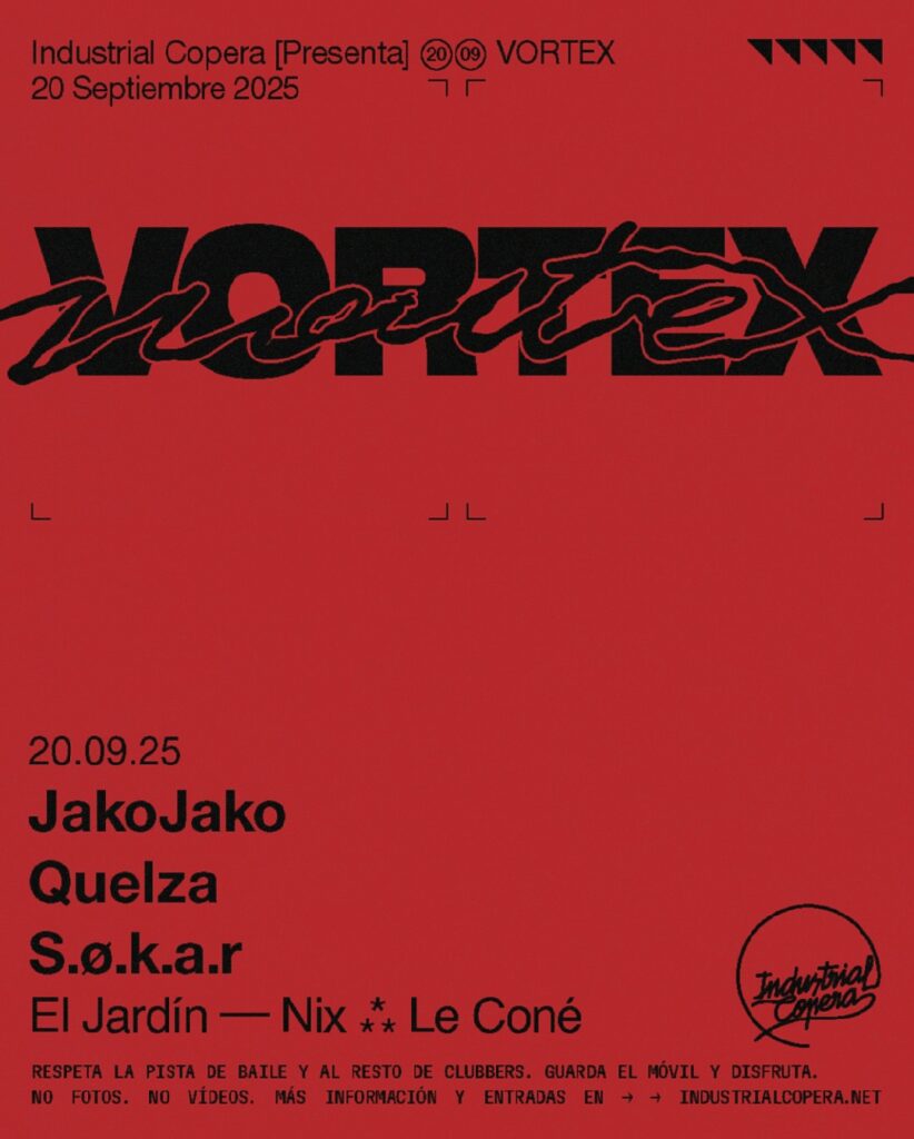 La temporada de Industrial Copera está a punto de arrancar y como es tradición, lo hará a plena potencia. Después del Destroy de este fin de semana, su próximo evento es un ejemplo perfecto de una filosofía que en ningún momento flaquea, un evento donde la música electrónica encuentra su senda más pura y estimulante. JakoJako, Quelza y S.ø.k.a.r. estarán presentes en la sala principal de la mítica sala granadina el próximo 20 de septiembre para ofrecernos una noche inolvidable al puro estilo Vortex.