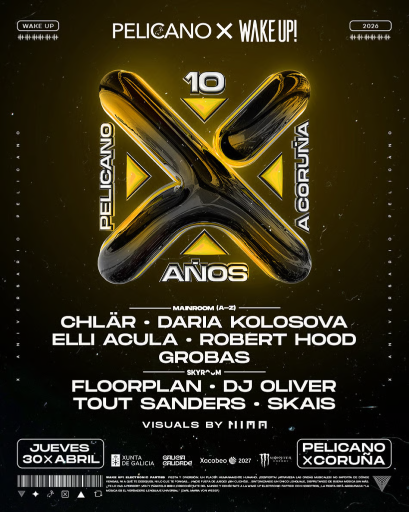 El club Pelícano de A Coruña celebra su décimo aniversario con una programación de alto nivel que confirma su papel dentro del circuito electrónico nacional. De la mano de Wake Up, los días 18 y 30 de abril y 8 de mayo reunirán a algunos de los nombres más relevantes de la escena global, situando a la ciudad gallega en el foco del clubbing esta primavera.
