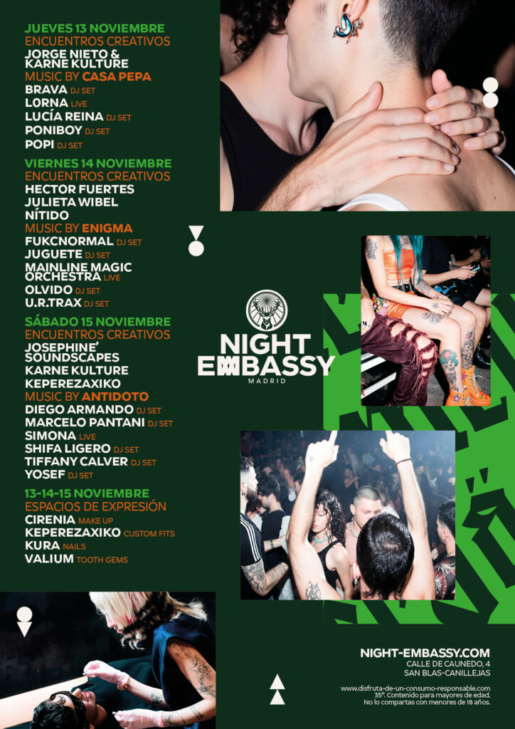Además, Night Embassy invita a explorar la identidad, celebrar la autoexpresión y llevar el espíritu libre de la pista al propio look de los asistentes. Como un gesto de creatividad colectiva, en cada jornada, y junto a talento local, los Espacios de Expresión reunirán distintas formas de jugar y explorar con la personalidad: con el nail art de Kura, los tooth gems de Valium, el make-up de Cirenia o la estación custom fit de personalización y upcycling de prendas junto al diseñador Keperezaxiko.
