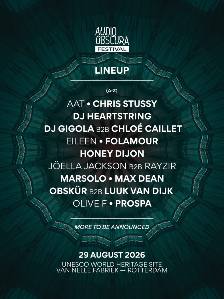 El productor de eventos electrónicos pionero y rompedor Audio Obscura anuncia el regreso de su festival insignia, Audio Obscura Festival, en el sitio Patrimonio Mundial de la UNESCO Van Nelle Factory en Róterdam el sábado 29 de agosto de 2026. Tras el rotundo sold out de su primera edición en 2024, este showcase único y al aire libre regresa en 2026, marcando un nuevo capítulo en el desarrollo de Audio Obscura como una plataforma cultural verdaderamente singular.
