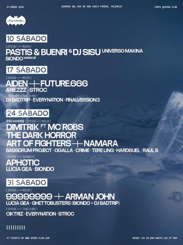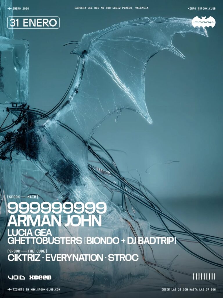 Spook cierra el mes de enero con una dosis de potencia y energía descontrolada. Encabezarán esta revolución 999999999, El secreto del éxito del proyecto de los italianos radica en su fuerza de personalidad. Cada patada atronadora, cada puñalada de sintetizador y cada línea ácida retorcida se dispara con una intención clara: todo está orientado a provocar la máxima respuesta física y emocional del amante de la pista de baile. No hay puntos intermedios, sólo un enfático tributo al duro, oscuro y profundo sonido de la noche. Junto al electrificante dúo tendremos en la sala principal a Arman John, Lucia Gea y Ghettobusters (Biondo & DJ Badtrip)