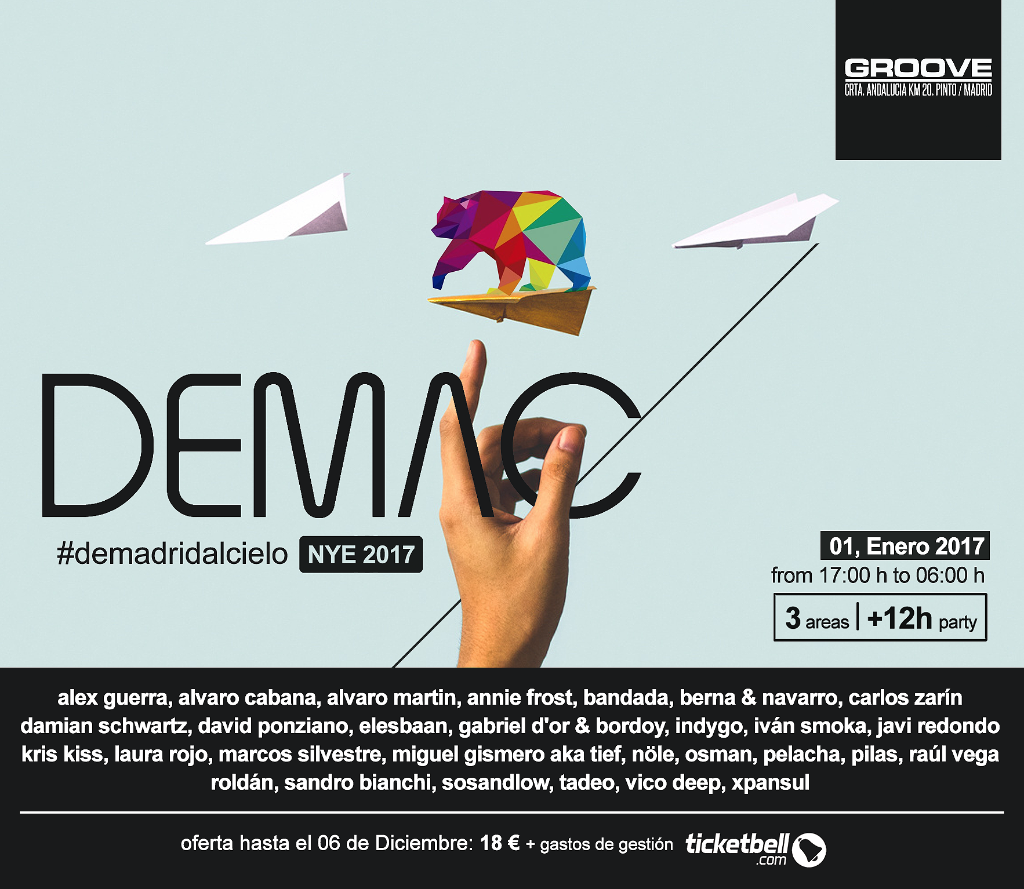 El 1 de enero la sala Groove acogerá un evento sin comparación en la capital. Un absoluto despliegue de la mejor electrónica madrileña de la mano de las principales figuras de su escena. Las actuaciones se dividirán en tres zonas, incluyendo la terraza cubierta, climatizada y con sonido Funktion One. 2017 inaugurará su andadura con DEMAC, un evento que huye de los clichés existentes en la industria electrónica para construirse en total oposición a los mismos. Frente a las macrofiestas y su masificación, frente a cachés astronómicos y precios desorbitados, frente a modas y tendencias pasajeras, nace DEMAC dispuesta a poner el énfasis en lo que realmente importa. Esto es, la música electrónica que se crea, vive y respira en la capital de la mano de sus principales protagonistas. El line-up de De Madrid al Cielo cuenta con lo más granado de la escena electrónica madrileña. Un selecto grupo de artistas entre los que podemos encontrar a los residentes de las sesiones más punteras de la capital. Nos estamos refiriendo a Alex Guerra y Nöle, figuras fundamentales de Stardust, Javi Redondo, antiguo residente de Mondo, Carlos Zarín, Vico Deep y Osman, rostros imprescindibles de Studio 76, David Ponziano, creador y residente de Halley, Elesbaan y Xpansul, residentes de la mítica Soma, Marcos in Dub y Pelacha, compañero esenciales de Goa y XYZ respectivamente, y SOSANDLOW, dúo de moda en la capital, y Miguel Gismero, residentes todos ellos en la exitosa Nox. A todos ellos se les unirá además Damian Schwartz, quien compone uno de los principales atractivos del evento como representante de las tendencias más vanguardistas de la capital. En sus múltiples publicaciones en CMYK Music y sus actuaciones en vivo ha demostrado su increíble capacidad para moverse del Jazz al House terminando en el Techno sin perder un ápice de coherencia o calidad. También estarán Álvaro Cabana, Sandro Bianchi e Iván Smoka, todos ellos pilares vitales del underground madrileño desde finales de la década de los ´90, Álvaro Martín, quien destaca por su carisma y dilatada experiencia, Gabriel D´Or & Bordoy, dúo propietario de Selected Records y de importante presencia internacional, Indygo, habitual de las famosas fiestas My Pleasure, Marcos Silvestre, propietario de Swat Records y creador de Roll Disk, Tadeo, dueño de Cyclical Tracks y Another Intelligence, fundador de Net28 y asiduo colaborador de CMYK Music y Apnea, Raúl Vega, sin quien los after no serían los mismos, Annie Frost & Kris Kris, Bandada (Unkle Fon & Paco Buggin), Berna & Navarro, Laura Rojo, Pilas y Roldán. Estamos, sin duda, ante el mayor despliegue de talento nacional que se haya visto en la capital en los últimos tiempos. De Madrid al Cielo no es un evento más de Año Nuevo, es una auténtica declaración de intenciones, una defensa contundente de la música electrónica nacional por encima de estándares o etiquetas, DEMAC es la evidencia de que una forma diferente de vivir la electrónica en la capital es posible. Las entradas se pondrán a la venta con un precio de 18€ más gastos de gestión y podrán ser adquiridas a través de Ticketbell, Ticketmaster, Oficinas de Correos, Fnac, Carrefour y Halcón Viajes. Además la llegada a Groove se facilitará con autobuses de recorrido continuo desde Madrid y la estación de Pinto. LINK DE VENTA bit.ly/demac1denero