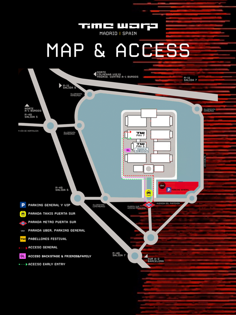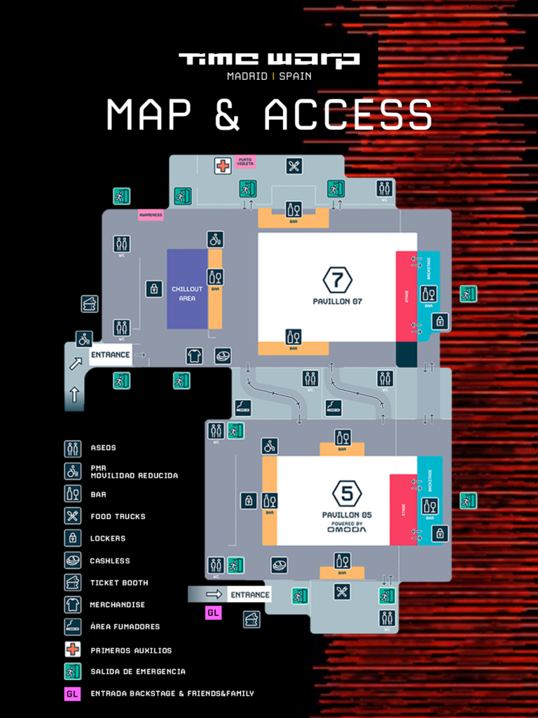 La programación de Time Warp Spain estará dividida entre los pabellones 5 y 7 del Recinto Ferial de IFEMA MADRID. Dos espacios independientes pero interconectados con un line up diferenciado, pensado para todos los gustos dentro del sonido club.